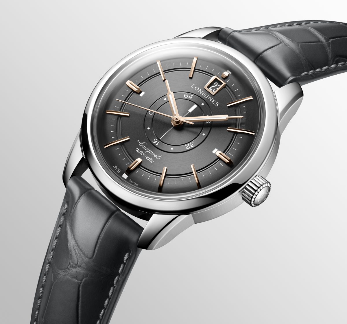 為紀念Conquest系列誕生70週年(1954至2024年),浪琴表重新詮釋Conquest型號9028之經典腕錶,推出全新Conquest Heritage中央動力儲存指示腕錶,重新演繹面盤中央的兩個旋轉圓盤呈現動力儲存狀態,向該款古董腕錶致敬。這種將動力儲存指示設置在中央轉動圓盤的設計是由浪琴表發明且獨家使用,其中央內圈圓盤上的棍形指標搭配中央外側轉盤可指示機芯動力的消耗程度(從64至0),指出所剩餘的動力儲存小時,亦即腕錶還能運行的時間。另外,透過手調轉動錶冠或手腕動作為錶上鏈時,能讓中央外側旋轉圓盤轉動,為腕錶儲存動力。因此,面盤的外觀美學會持續變化,營造一種原創、時光流動的詩意。
