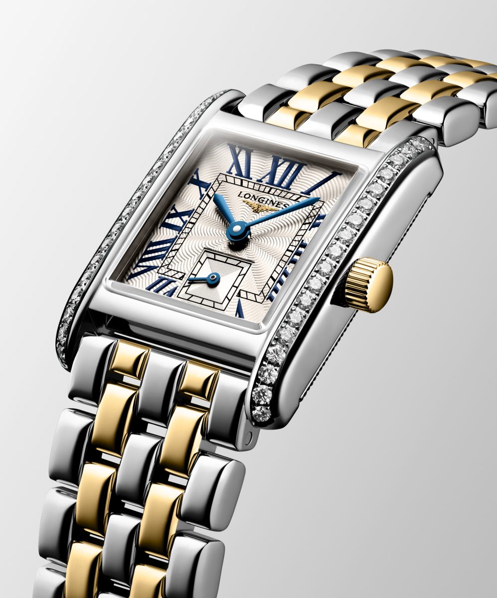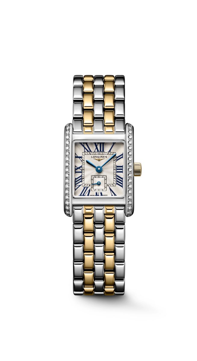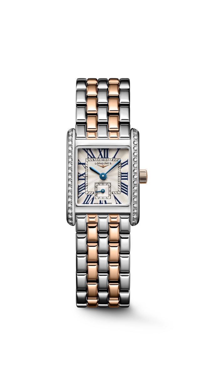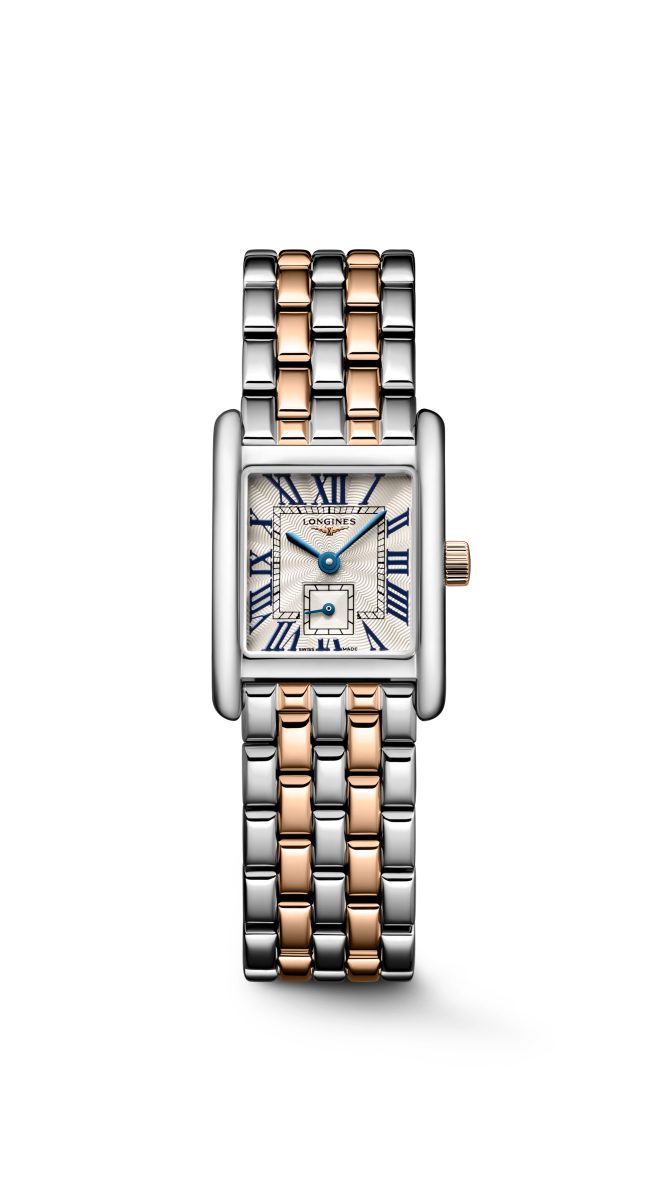 迷你多情18K雙金材質系列搭載飾有羅馬數字的銀色長方形錶盤,精細的「flinqué」飾紋襯托錶盤的高雅特色。這種浮雕幾何紋理營造巧妙的機刻雕花效果,能夠捕捉光線,創造立體效果。藍色漆繪羅馬數字與藍鋼指針形成優雅對比,而位於6點鐘位置方形計盤的小秒針顯示則為整體設計添入浪琴表的獨特元素。