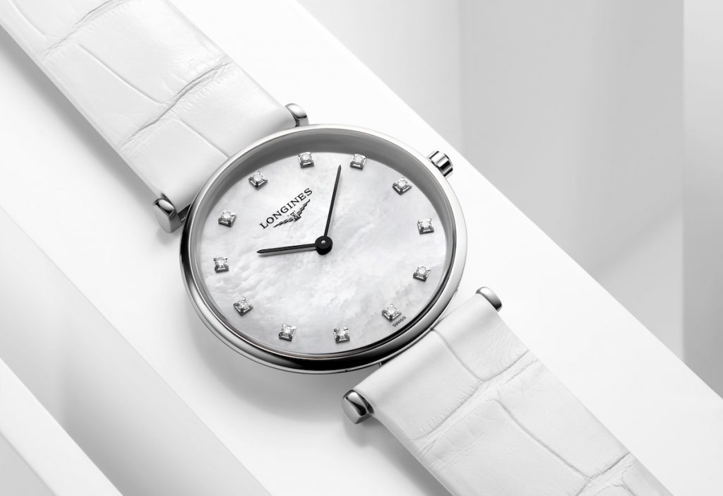 今年全新推出38毫米錶徑尺寸,提供不鏽鋼錶殼或是或黃金/玫瑰金PVD錶殼款式,面盤亦提供黑、藍色、銀色或金色多種選項,飾以羅馬數字、鑽石或漆繪時標,亦可選擇搭配不鏽鋼錶帶或皮革錶帶,由L591自動上鍊機芯所驅動。適合女士配戴的29毫米錶徑則推出搭配珍珠母貝面盤與鑽石時標的新款式,錶款著名的纖薄設計由白色皮革錶帶完美收尾,搭載L420石英機芯,展現優雅風采。