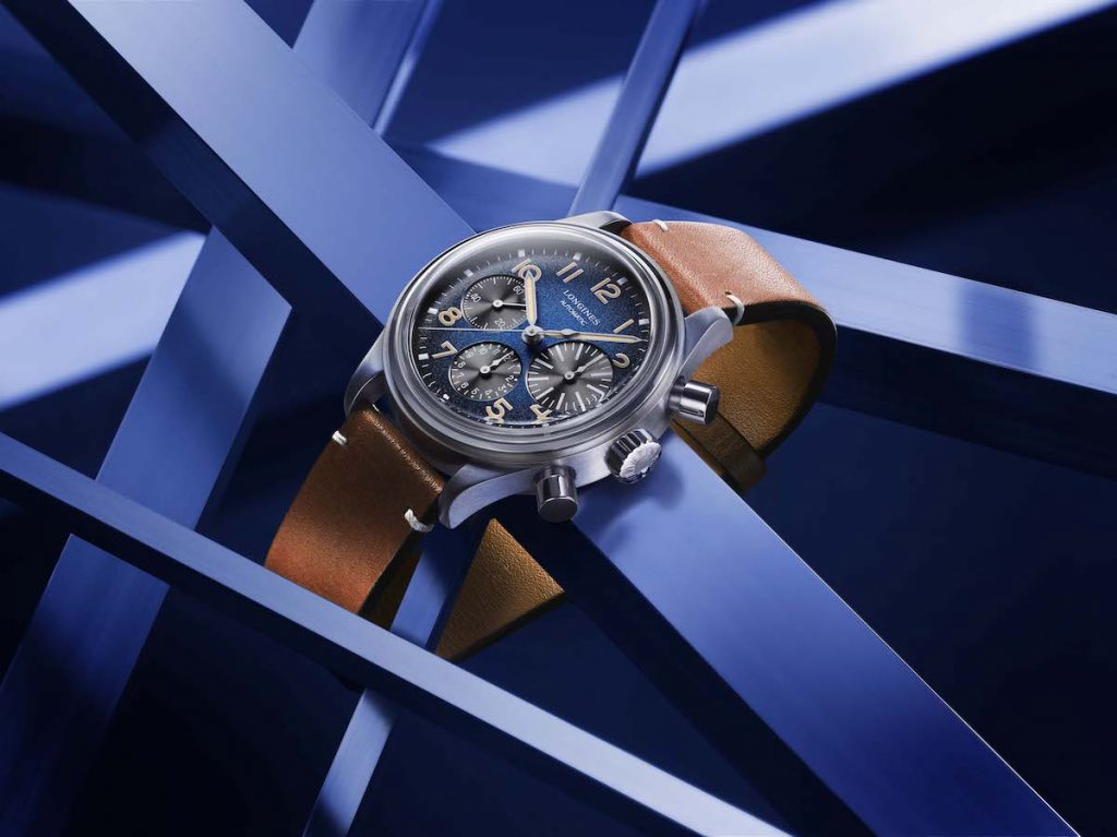 Longines 浪琴表 Avigation BigEye 復刻大眼計時腕錶鈦金屬錶殼,內部設置的L688導柱輪計時碼錶機芯採用確保精準度並提升防磁性能的矽游絲,漸層金屬藍面盤上點綴覆有SuperLuminova®夜光塗料的噴砂黑色指針及阿拉伯數字時標,並設置9點鐘秒針計時盤、6點鐘12小時計時盤以及3點鐘的加大30分鐘計時盤。雙面多層防眩光處理的箱形藍寶石水晶鏡面,以及旋入式鐫刻底蓋亦展現這件傑作的先進技術。