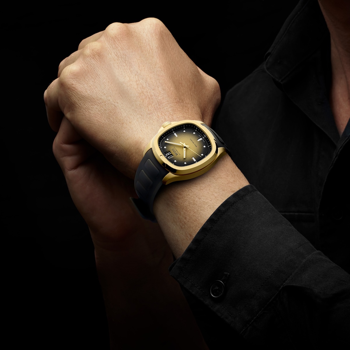 Multifort TV Big Date 不僅擁有搶眼的復古輪廓,更在錶盤細節上展現極致工藝。金色錶盤採用由內而外的黑色漸層設計,搭配標誌性的橫向拉絲紋理,讓光影在腕間流轉時呈現豐富的立體層次。12 點鐘位置的瞬跳大日期窗,以俐落線條成為視覺核心,將經典設計與實用讀時完美融合。此外,時標與指針皆覆以 Super-LumiNova® 夜光塗層,無論晝夜,皆能精準掌握每一抹榮耀時刻。