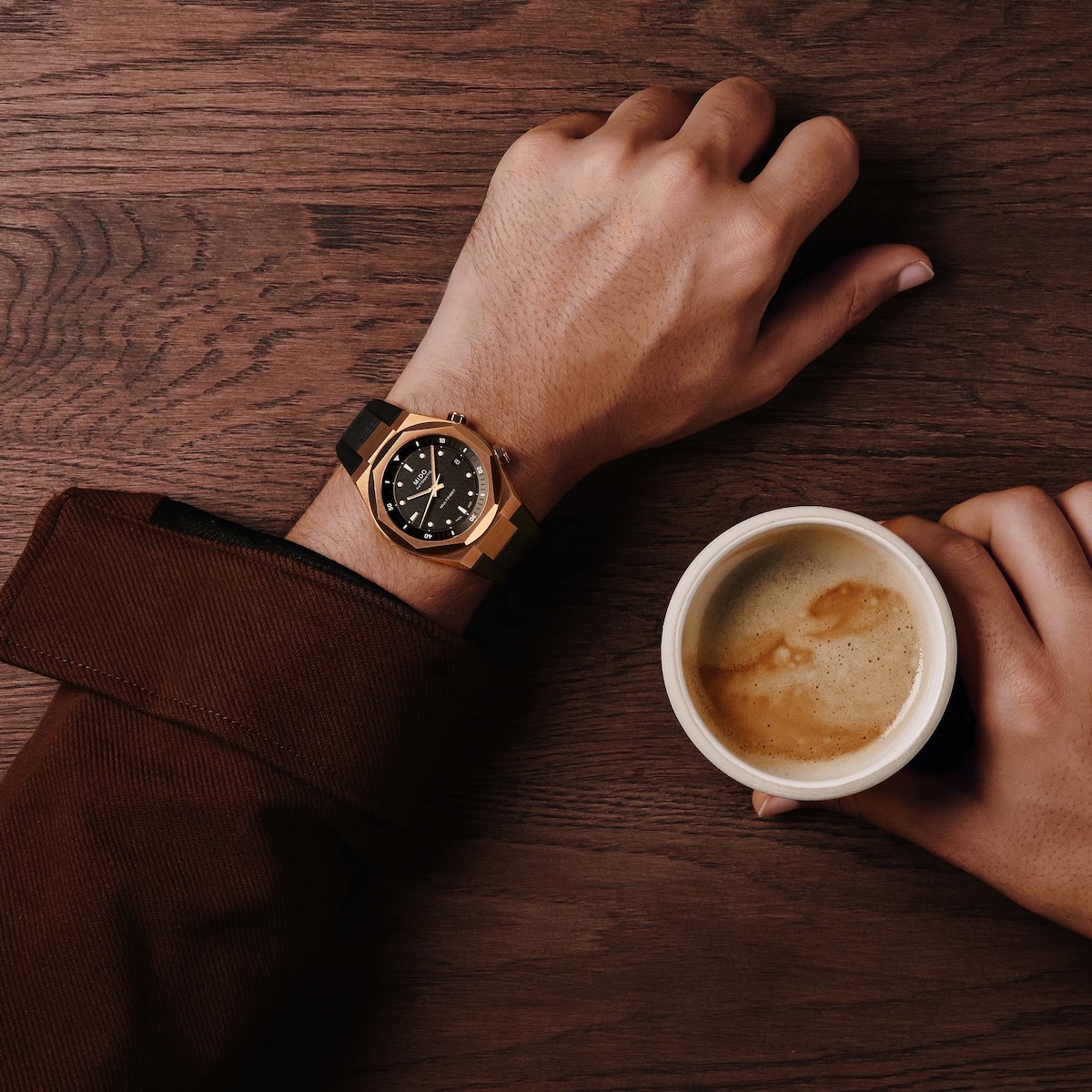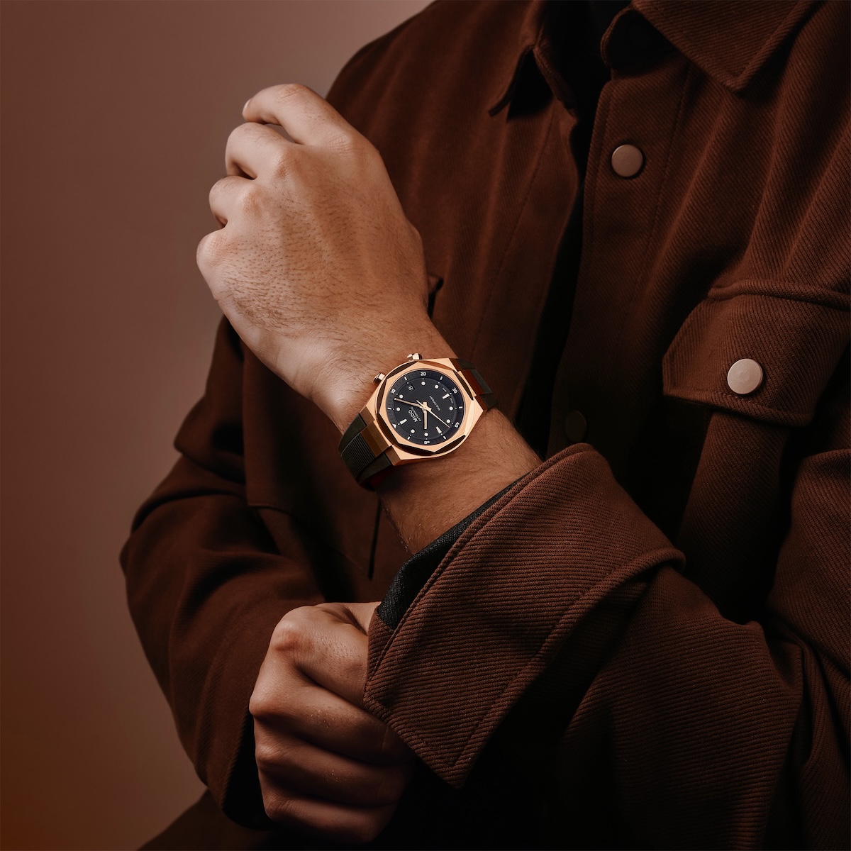 在Multifort 8 Two Crowns 以玫瑰金色調展現出一份內斂的華麗。標誌性的八角形設計與立體切面,不僅強化了視覺深度,更賦予腕錶一種剛勁有力的現代風格。這款腕錶巧妙地將功能區分,透過雙錶冠配置讓操作回歸直覺,展現瑞士製錶的細膩思維。立體針標的層次與夜光性能,讓這款腕錶無論是在燈火闌珊的聚會或是商務場合,都能以沉穩之姿,成為您腕間最亮眼的犒賞勳章。
