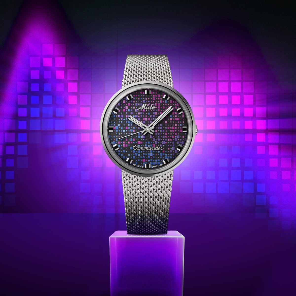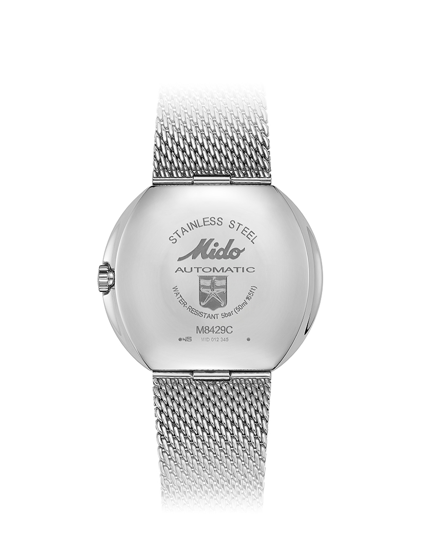 雋永Commander 1959腕錶的錶盤轉化為一種21世紀現象,錶盤黑色背景上精心排列的像素構成幾何雲朵。即使在黑暗中,此錶依然呈現充滿趣味的夜光粉紅色與藍色風貌。顯示面盤保持清晰易讀並獲得鑽石指針與拋光時標的襯托,時針與分針以及拋光錶盤邊緣的12個圓點鍍有原色Super-LumiNova®夜光塗層,確保在夜間的最佳易讀性。 此錶採用一體成形拋光不鏽鋼錶殼,令人聯想到鵝卵石的滑順性。錶殼搭配纖薄、精簡的錶圈,錶殼線條延伸至極致舒適與服貼的經典米蘭錶鏈。裝飾熱燙MIDO美度表標誌的壓克力水晶鏡面是另一項復古元素,並為這款特別版腕錶增添生動的反射光澤。
