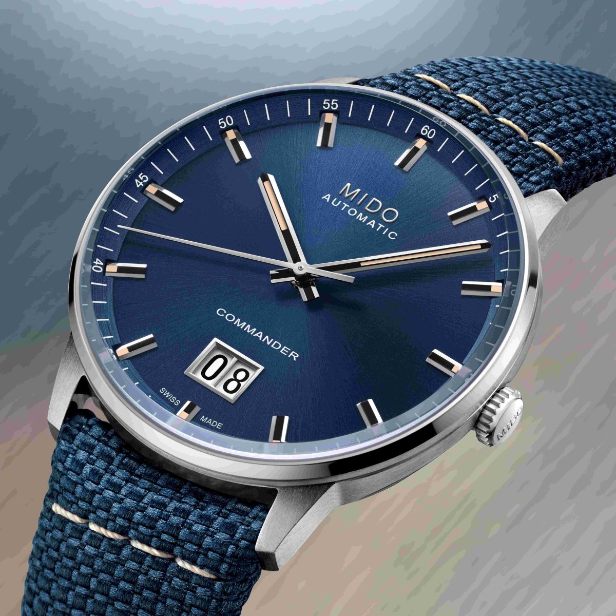 與錶盤同色調的海軍藍色精緻織物風格皮質錶帶,飾以米色縫線,則與時標和刻度相互呼應。位於6點鐘位置的標誌性大日期窗,雙視窗的設計除了展現簡潔且極具張力的設計美學,同時讓錶迷輕鬆讀取日期。全新腕錶提供MIDO Caliber 80自動上鍊機芯,動力儲存長達80小時,並搭載擁有卓越精準度的Nivachron™鈦游絲,堅實可靠、經久耐用,體現MIDO瑞士傳統製錶業悠久的歷史與精湛工藝。