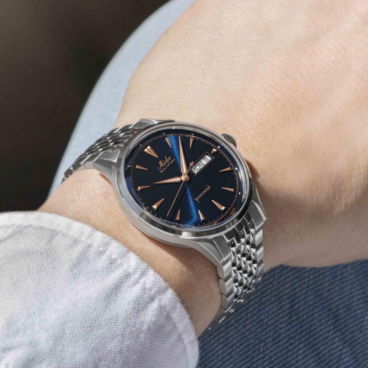 為致敬MIDO美度表自誕生以來至今精湛的高級製錶技藝,全新限量錶錶盤上印有復古斜體Mido標誌和原版Powerwind標誌,源自於Multifort先鋒系列的經典款式。午夜藍色絲光打磨太陽紋錶盤,鑽石切割指針和時標圈以亮眼玫瑰金色點綴。時針、分針、12個時標點以及3、6、9、12點鐘位置的時標刻度均經過Super-LumiNova®白色夜光塗層處理,確保不論白天還是夜間均能精準讀時。錶以盒型藍寶石水晶玻璃面呈現復古風格,呵護著鐫刻有Mido標誌和原版Powerwind標誌的錶盤。