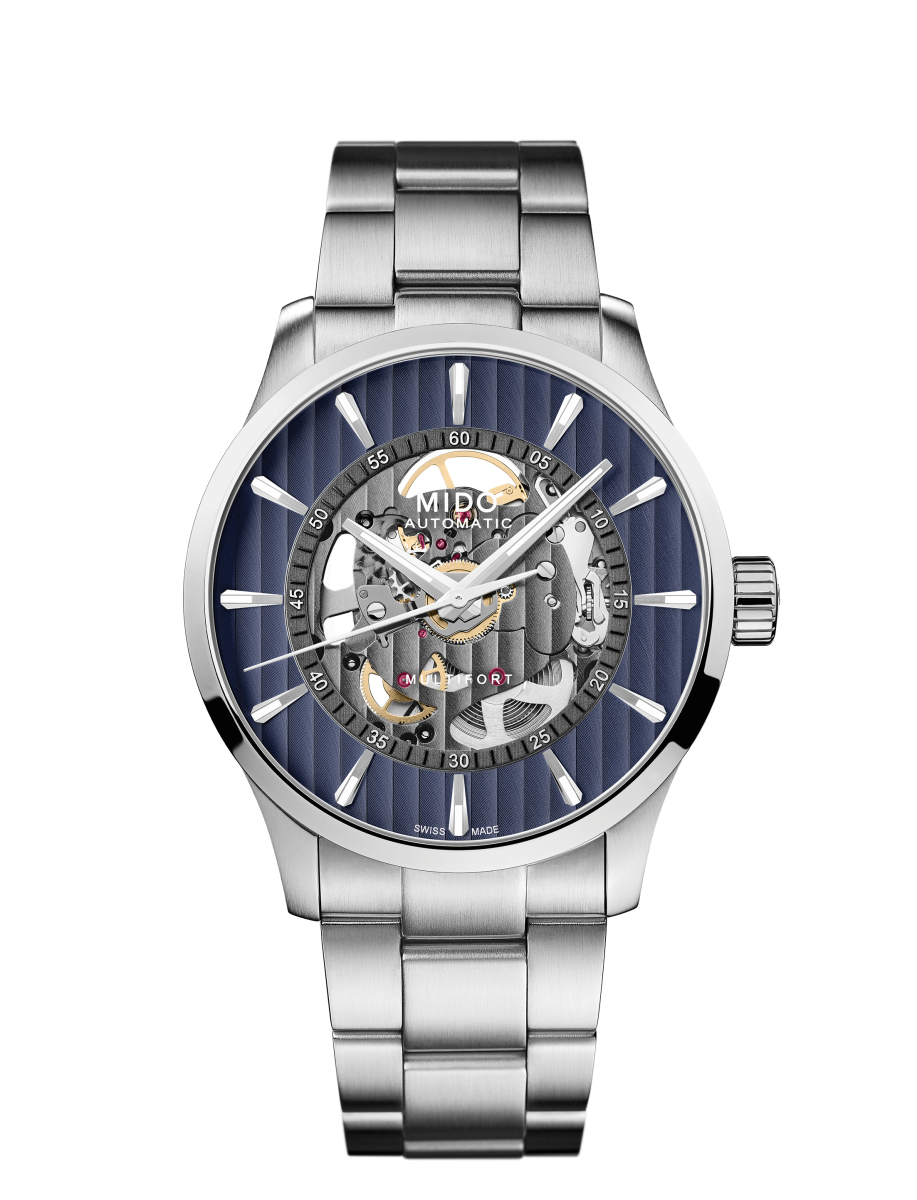 Multifort Skeleton Vertigo Blue先鋒系列鏤空腕錶/型號:M038.436.11.041.00/錶徑:42mm/機芯:MIDO Caliber 80自動上鍊機芯/動力儲存:80小時/防水深度:100m/建議售價: NTD 36,800