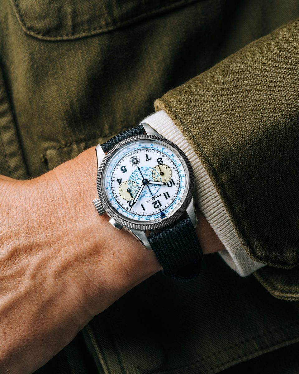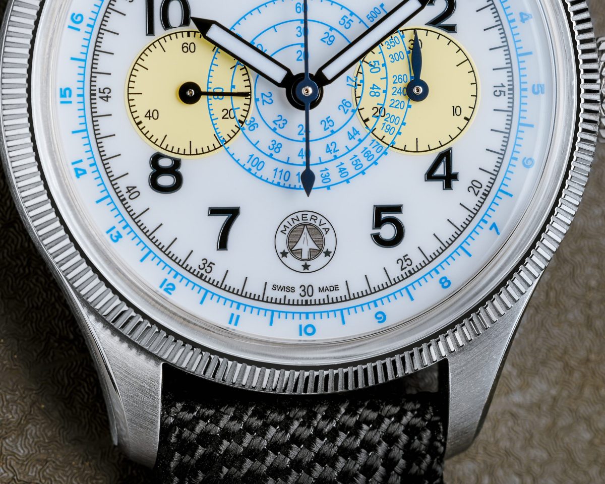 錶盤上方飾有可旋轉的藍色計時箭頭(Blue Arrow),由雙向旋轉的18K白金凹槽紋錶圈控制。這個箭頭為腕錶增添了另一個計時複雜功能,其設計參照了經典的Minerva碼錶和腕錶。1927年,Minerva曾推出一款帶有內部旋轉錶圈的碼錶,用於倒數計時;隨後在1939年,Minerva推出另一款計時腕錶,被稱為「紅箭頭」(Red Arrow),這款腕錶配備了凹槽紋旋轉錶圈,方便戴手套的飛行員操作。箭頭不僅具有實用性,更是向羅馬女神Minerva致敬,Minerva是工匠的守護神,手持尖端帶有箭頭的長矛。