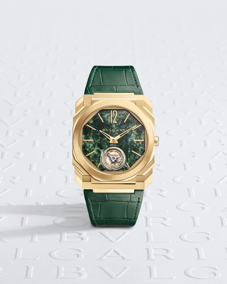 延續品牌對技術與設計的執著,如今新推出’的 Octo Finissimo Marble Tourbillon 大理石超薄陀飛輪腕錶以雙重承諾再次驚艷登場。黃金錶殼直徑 40 毫米,厚度僅 4.85 毫米,搭配來自義大利阿爾卑斯山頂級礦區的「Verde Alpi」翠綠色大理石錶盤,訴說羅馬建築美學與千年歷史的呼應。獨特色澤與自然紋理勾勒出無可取代的視覺張力,搭配金色錶圈與深綠色皮革錶帶,展現大膽鮮明的藝術風格,重新演繹傳統材質的當代之美。