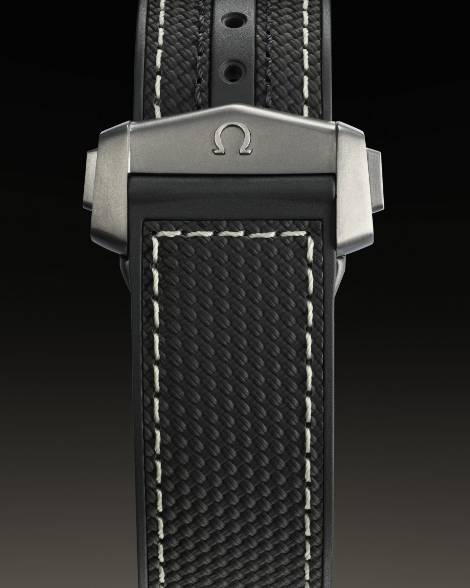 此外,歐米茄還選用了對比鮮明的5級鈦材質製作錶圈主體和錶帶折疊扣,以及經過噴砂處理的錶盤,搭配煤灰色指針和時標。這種鈦材質被航太業廣泛採用,它強調了腕錶的耐用性,又不增加過多的重量。