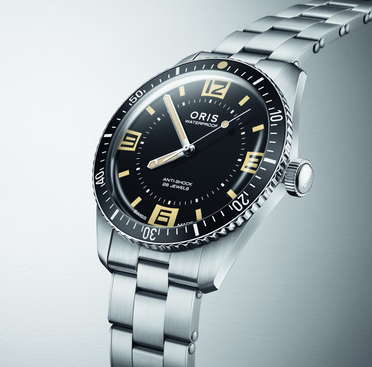 Oris推出了60週年紀念版潛水錶,向1965年首款潛水錶致敬,並融合傳統與創新。新款腕錶採用直徑40mm的不銹鋼錶殼、雙向旋轉錶圈及瑞士製自動上鍊機芯,搭配不銹鋼錶帶。錶殼的復古框架之外,吸引人目光的則是面盤上的懷舊細節:黑色錶盤上位於 6 點鐘位置的ANTI-SHOCK字樣、短型時標設計,3、6、9 和 12 點鐘靈感皆源自1965年原版的加大夜光數字,以及復古Oris標誌下方的WATERPROOF,這一元素在Oris 的現代款式中首次復刻。