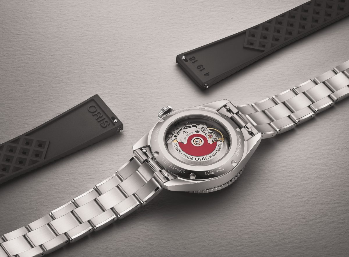 金屬鍊帶經過精緻改良,並配備了快速更換系統,可輕鬆更換套組中隨附的黑色橡膠錶帶。除了提升防水性能外,Divers日期腕錶現在還配有透明底蓋。搭載的Oris Calibre 733機芯,提供41小時的動力儲備。經歷六十年,Divers依然為佩戴者帶來持續的喜悅。
