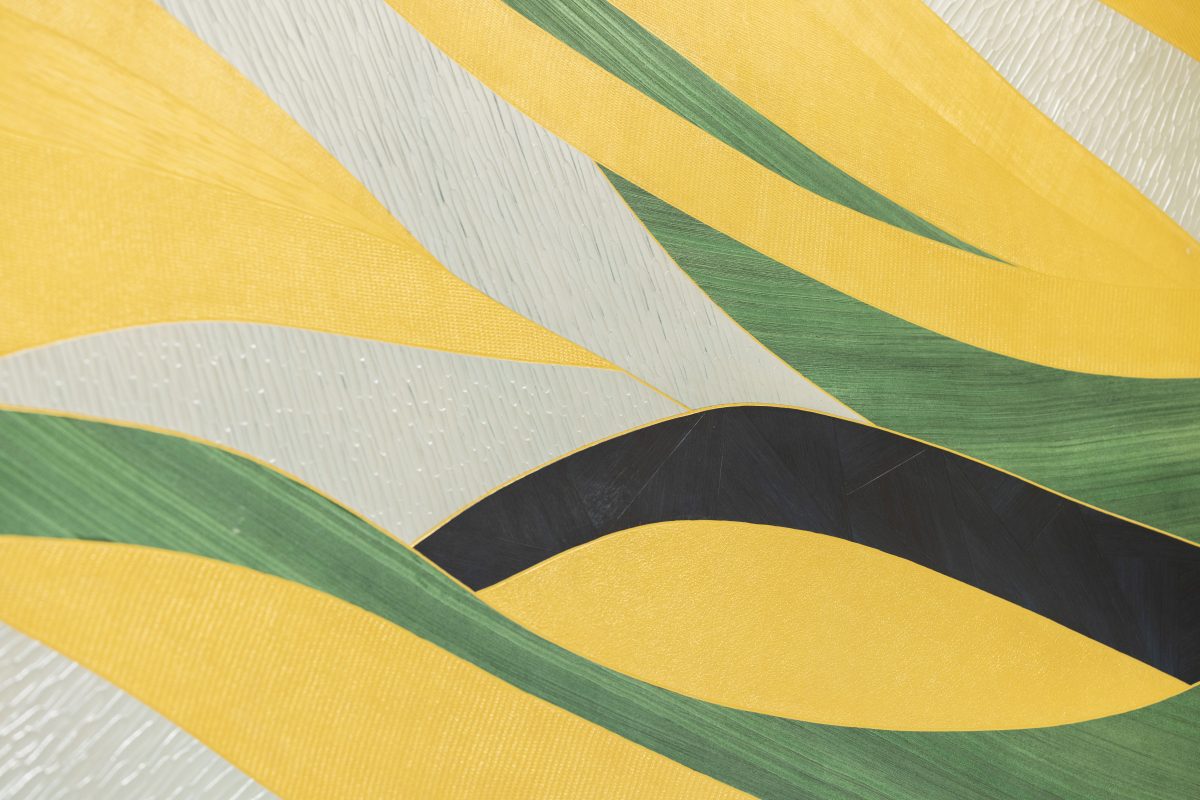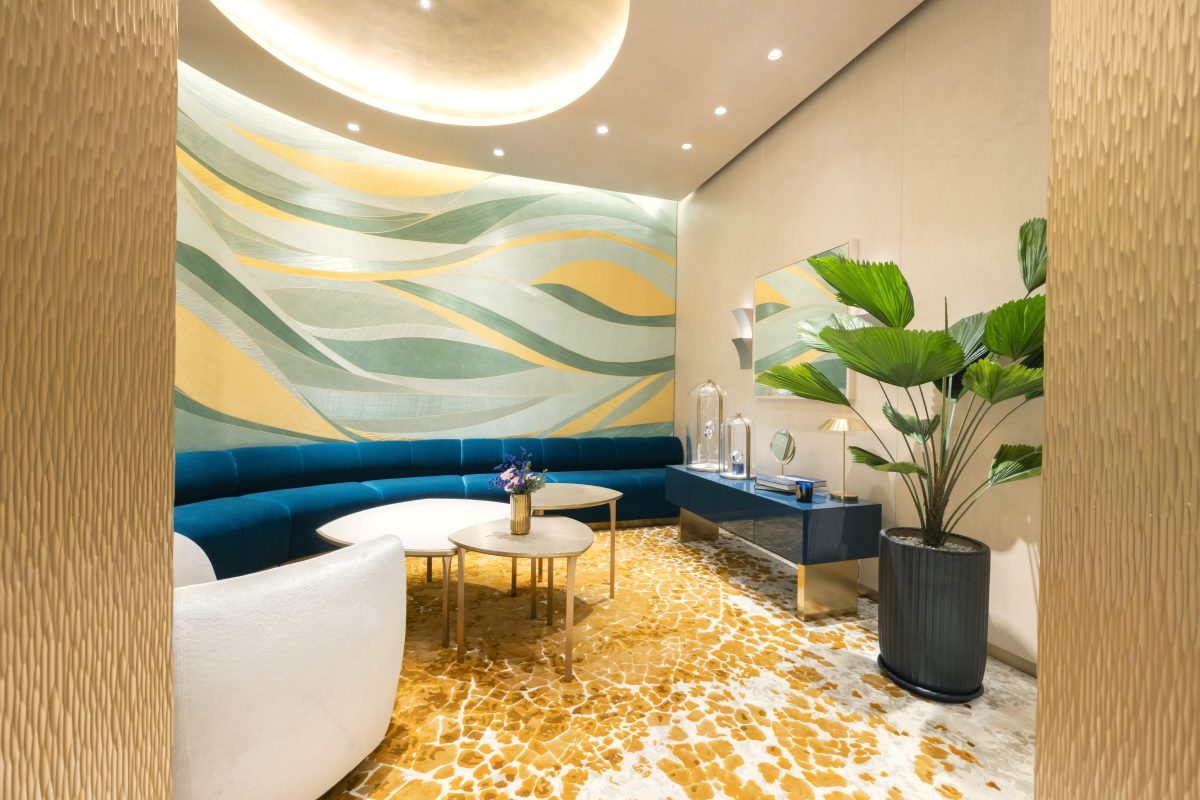 踏入大門後,將被一堵由多層次綠、藍、金所交織的手工壁畫深深吸引,這巨幅的藝術創作向世家的紋理、色彩和石材致敬,在增強整體的美學效果的同時,亦替的新舊傳承的建築概念之間建構橋樑,這幅手工壁畫一路綿延至擁有絕佳私密性的頂級貴賓鑑賞沙龍,提供尊貴的賓客擁有最安全且獨特的感官體驗。