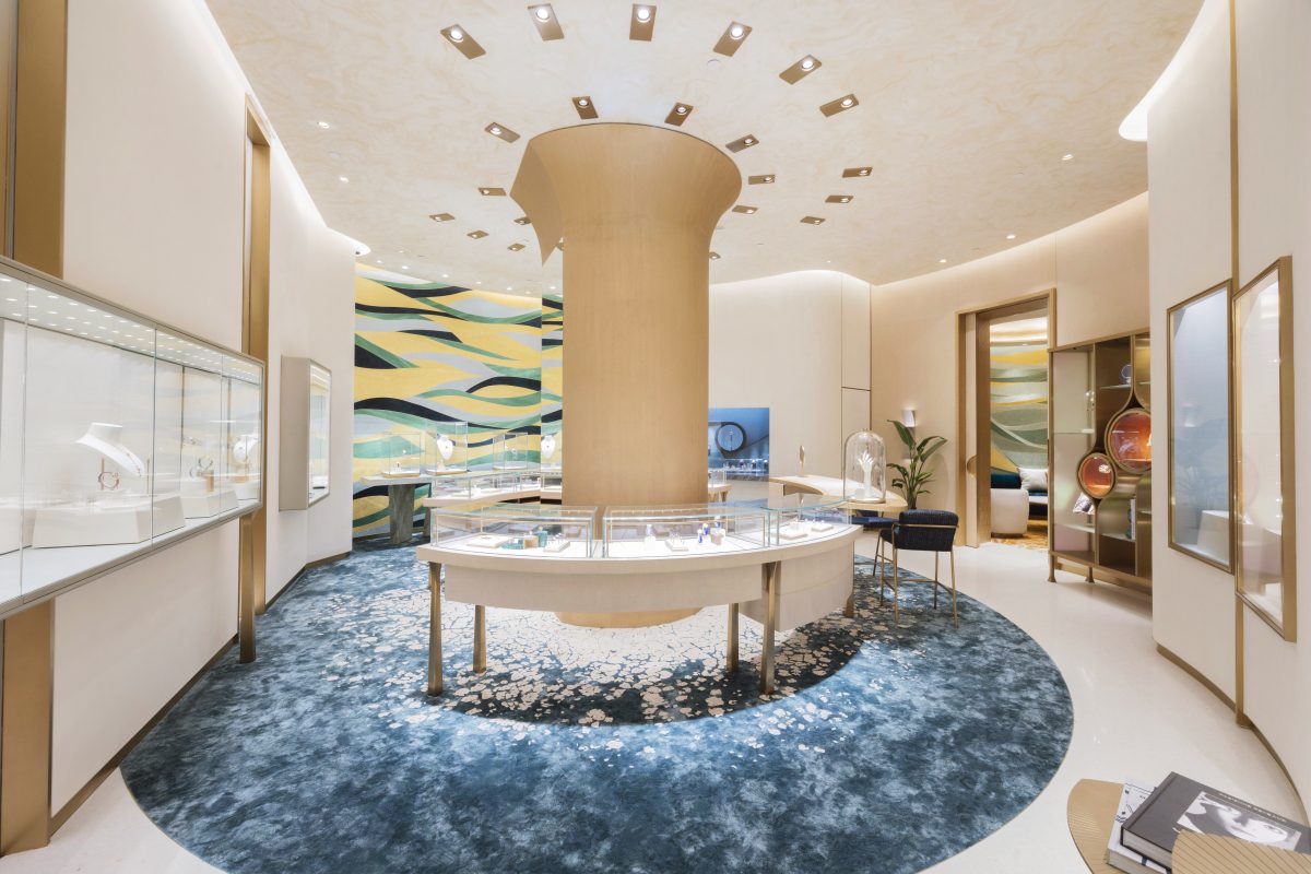 抬頭仰望,可欣賞由藝術家Julien Gautier親手繪製絕美天花。周遭充滿了孔雀石、蛋白石和土耳其石等所蘊含的原始能量,向為伯爵寶石學家帶來靈感的珍稀寶石讚頌,富饒而和諧,巧妙地展現世家經典優美的作品曲線。
