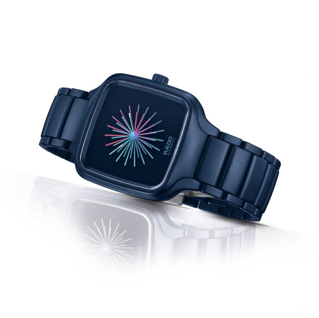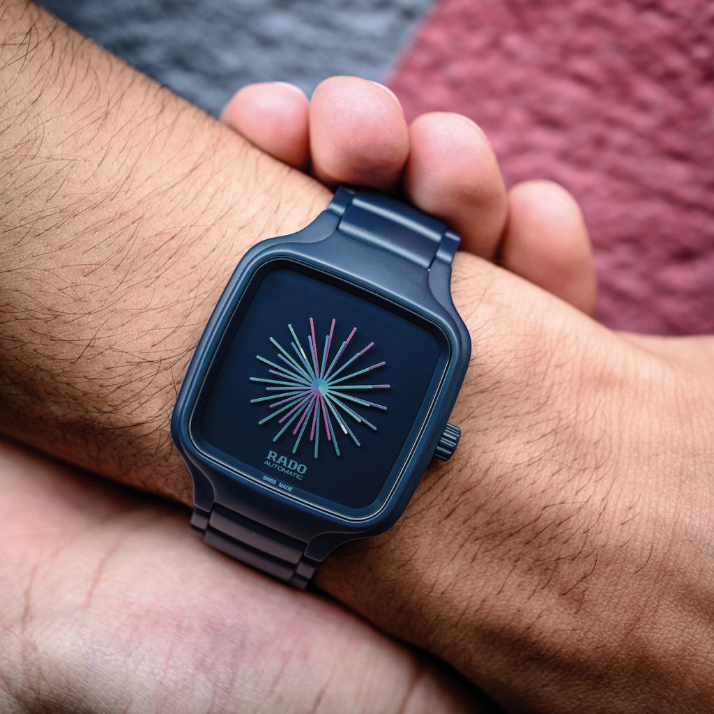 Thukral和Tagra以其獨特的設計思維眼界,結合雷達表在高科技材質與先進技術的優勢,嘗試從時間與空間中,呈現出人類作為獨立個體的短暫無常,亦同時彰顯了與他人建立連繫的重要性,以及人與社群之間的關係。藍粉漸變色的放射狀星形指針坐落在深藍色的錶盤中央,象徵著多個時區,覆有白色Super-LumiNova®夜光塗層的分針與時針指示當地時間,象徵著個體與社群的連結。由高科技陶瓷打造一體成型錶殼與錶帶,不僅輕盈舒適,其方形結構與中央的指針設計相互呼應,帶來方中帶圓的平衡美感,鮮明的選色更讓視覺聚焦,突破傳統製錶對於時間顯示的設計框架。