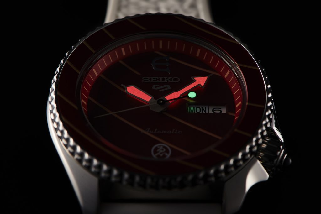 面盤上帶有夜光的時分針和秒針,在黑暗中發出的亮光也特別採用了鮪魚刺身和芥末的紅綠配色,使得整只腕錶從頭到尾都充滿了設計及玩心意味。
