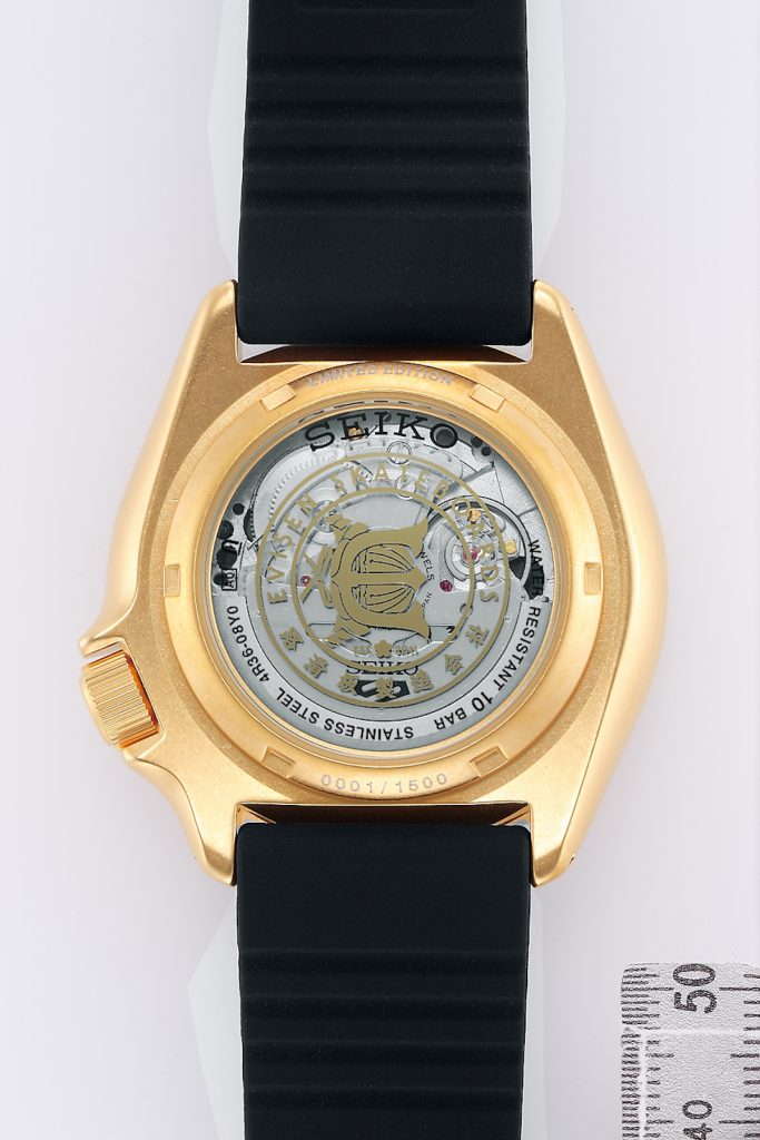 第二款則是以當道的黑金配色作為構成錶款的主色調,將EVISEN象徵日本武士鎧甲的頭盔logo融入於設計當中;搭配矽膠錶帶上飾有原創的佩斯利變形蟲花紋,在配戴時光線的變化使得錶帶上的圖騰若隱若現呈現。旋轉錶圈上的分鐘數字特別以漢字標示,面盤邊緣的刻度也採用了連續交錯的波紋,透過這些細節讓錶款的日式風格更加凸顯耀眼,在背蓋上也刻有EVISEN武士頭盔logo及0001/1500~1500/1500的限量序號。