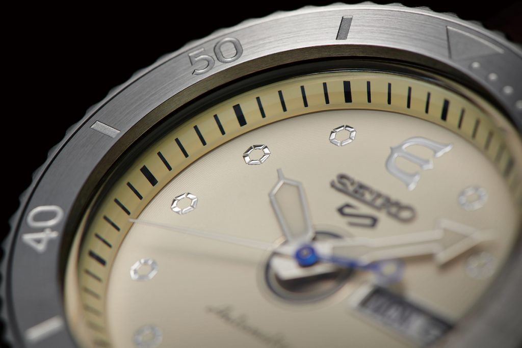 此次<Seiko 5 Sports >聯名系列推出了3款錶款,首款是以當代流行的米褐色錶面搭配茶色小牛皮錶帶為設計,錶款的面盤意象來自滑板輪子的橡膠材質,而牛皮錶帶上的細緻木紋則是刻畫了像是滑板木質板身的材質,整只錶款可說是純正地將滑板還原再現。