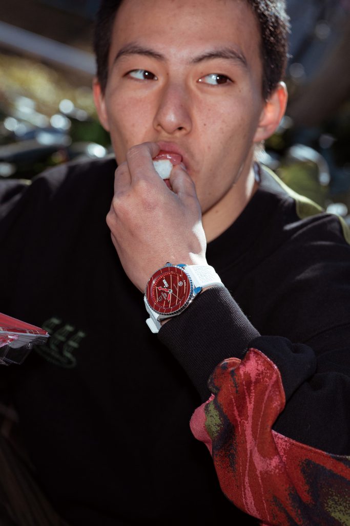 作為系列聯名款的壓軸,同時也為造型相當亮眼的設計錶款,在外觀設計上是以日本具代表的日式料理鮪魚刺身造型為發想,並在白色的錶帶上壓印壽司米飯的立體質感,還原擬真程度可說是相當細緻。在除了刺身的呈現外,錶冠末端點綴的黑色則是象徵了吃壽司時蘸用的醬油,讓整體錶款增添了一絲幽默風趣。