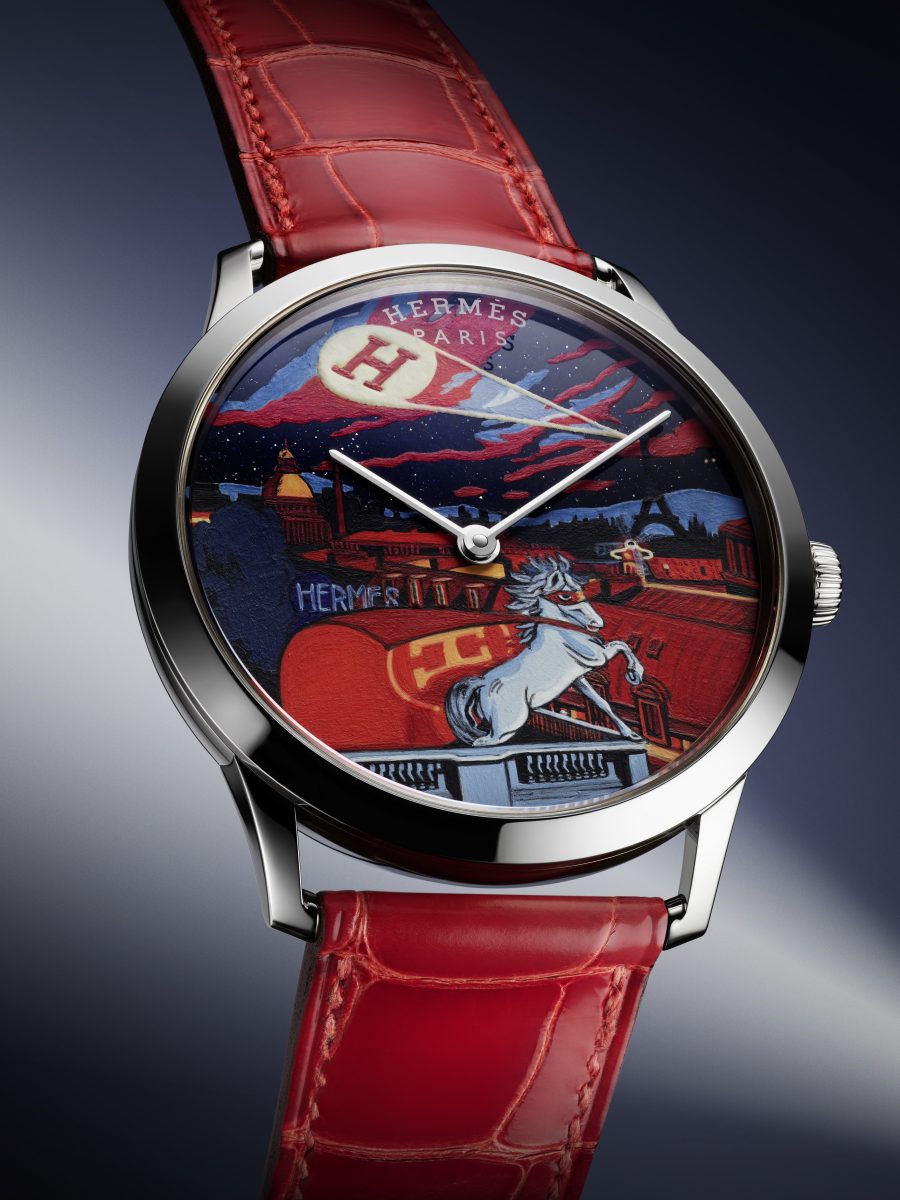 他英勇且獨來獨往,介於漫畫人物和希臘神祇之間。藉由出自品牌的全新超級英雄人物Super H,愛馬仕展開一段全然趣味及具創意的時間插曲。Slim d’Hermès Minuit au Faubourg 工藝腕錶與普普藝術及巴黎的世界融為一體,創作出輕巧且與眾不同的鐘錶彩繪藝術,誕生兩個款式,每款限量24只。此圖案主題來自Dimitri Rybaltchenko於2014年所設計的絲巾。