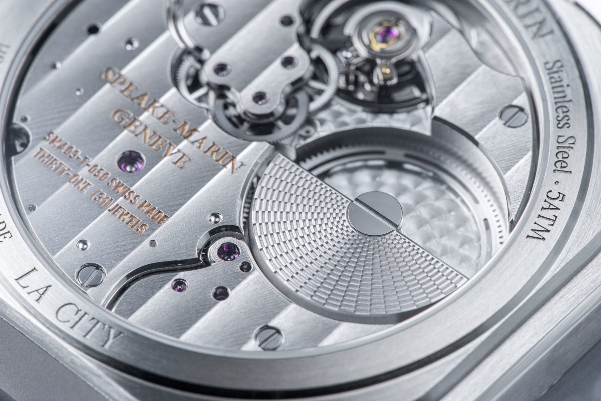 Ripples金屬綠腕錶搭載了自家研發的SMA03-T自動上鏈機芯,配備鎢金微型擺輪、鍍銠的日內瓦波紋、手工倒角拋光邊緣和內角。SMA03-T機芯由144個零部件組成,由Speake Marin瑞士製錶工坊“Le Cercle des Horlogers”開發、組裝和測試。它以每小時28,800次的頻率擺動,配有31顆寶石,對確保機芯平穩運行和長壽命起著關鍵作用,當完全上鏈時,機芯具備52小時動儲。這枚機芯的強大性能也證明了Speake Marin一貫以來對製錶卓越的承諾。