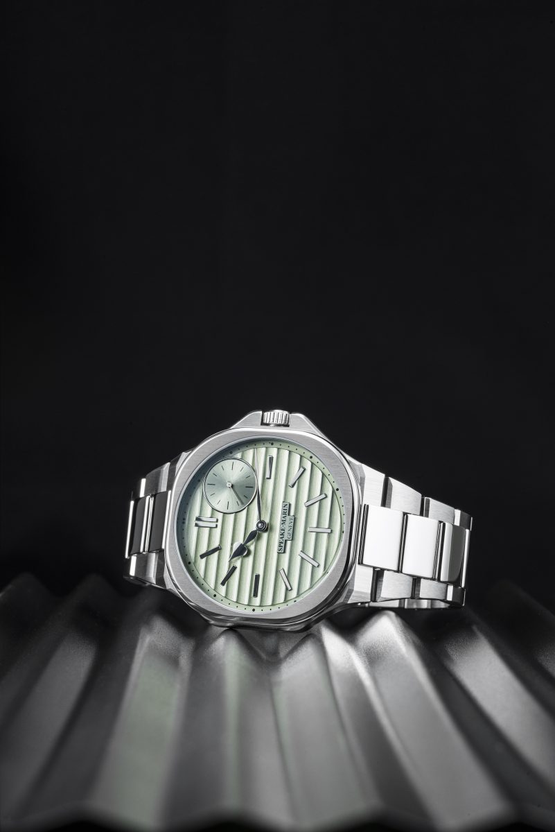 錶盤的金屬綠色調是經過精湛的工藝製作而成的。為了實現Speake Marin獨特的綠色,需要一個複雜而精確的過程。錶盤由鍍銠的黃銅製成,可以呈現不同的光線反射。錶盤刻有手工磨砂的水平波紋,並覆蓋了一層金屬綠色PVD塗層,最後再塗上一層透明的漆,讓波紋在不同的光線下更為立體閃耀。錶盤上的立體波紋圖案不僅創造了光影的動態交互,更增強了時間的可讀性。設計風格鮮明的錶盤搭配清晰閱讀的實用性能,正是Ripples脫穎而出的精湛之處。