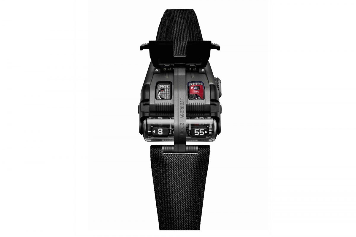 UR-112 Aggregat的機芯僅重25.5克,具備跳字式時、分及秒顯示,錶殼兩邊錶鏡下是三角柱體小時及分鐘顯示器:左邊是跳字小時,12個雕刻小時數字填上Super-LumiNova夜光物料,像機械翻頁式顯示板,隨著時間推進轉出一個個小時數字。右邊是由相同系統驅動的分鐘顯示器 ,每隔5分鐘跳一次。跳字小時的動力來自分鐘的推進,到60分鐘的一刻,之前行走3,600秒所累積的動力就會瞬間釋放,推動下一個小時數字轉出來。