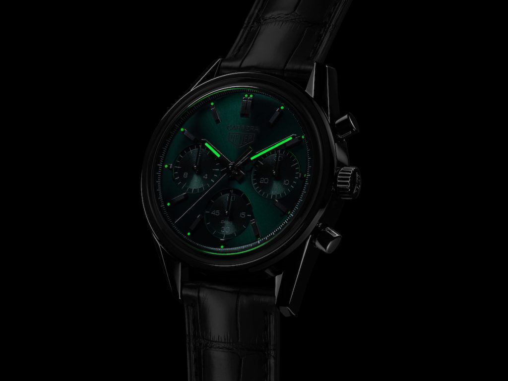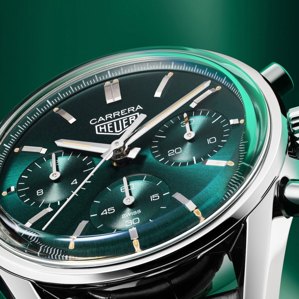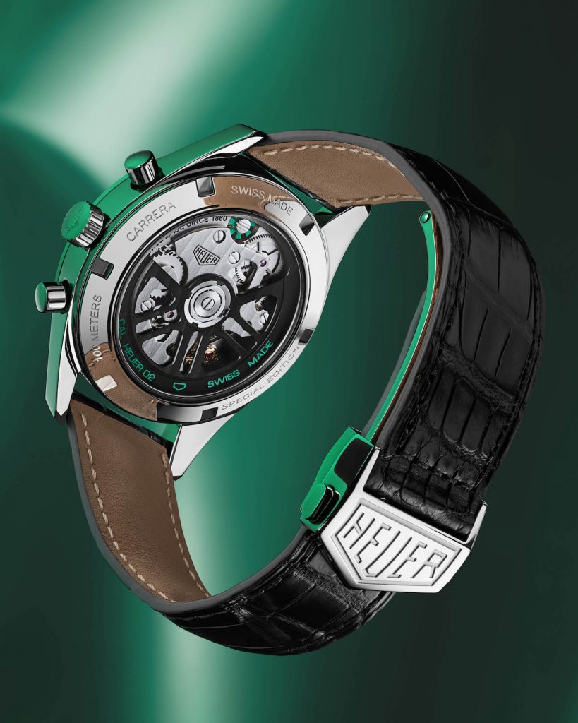 TAG Heuer泰格豪雅Carrera綠面限量自動計時腕錶選用Heuer 02自製機芯,由168個零件組成,包括導柱輪和垂直離合裝置,並提供80小時動力儲存。