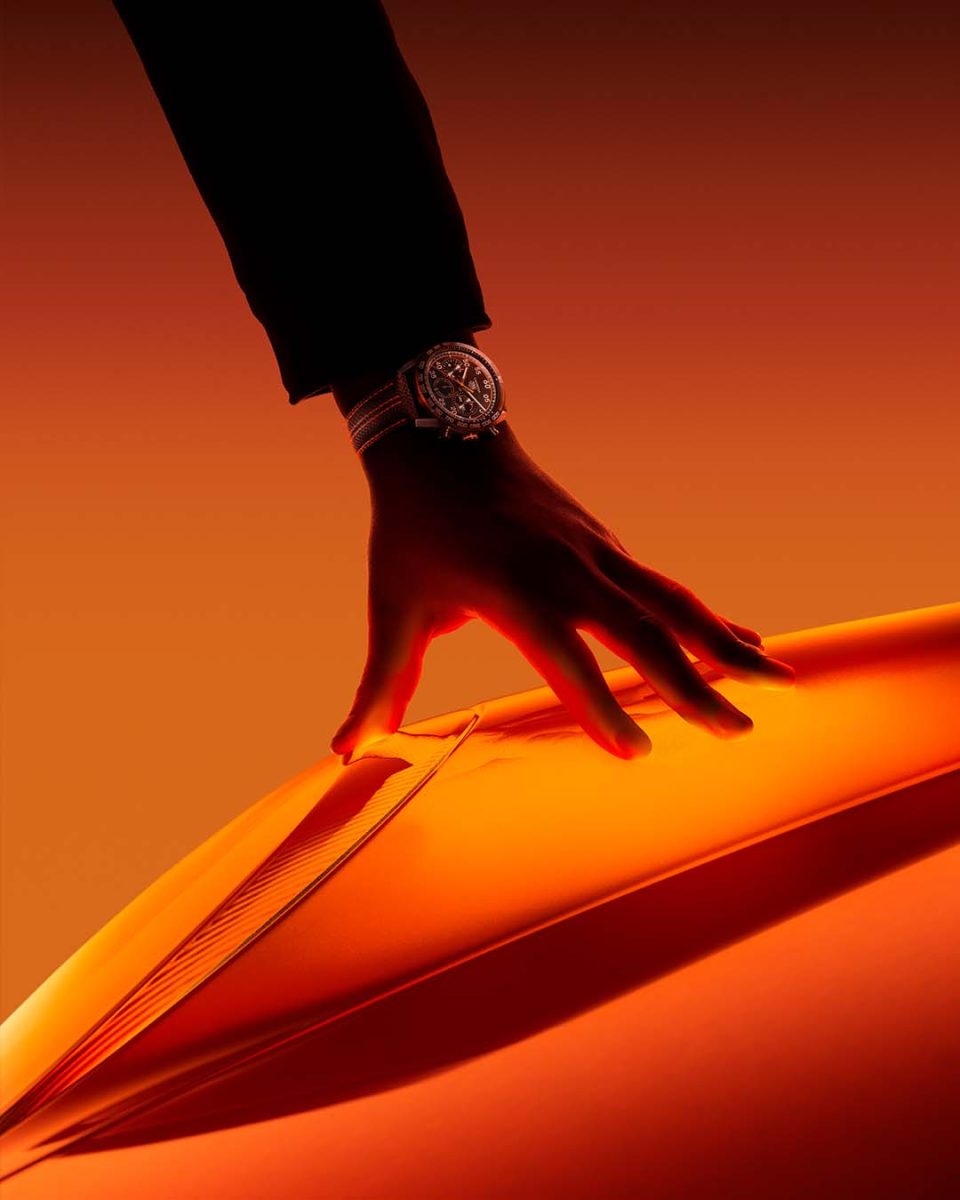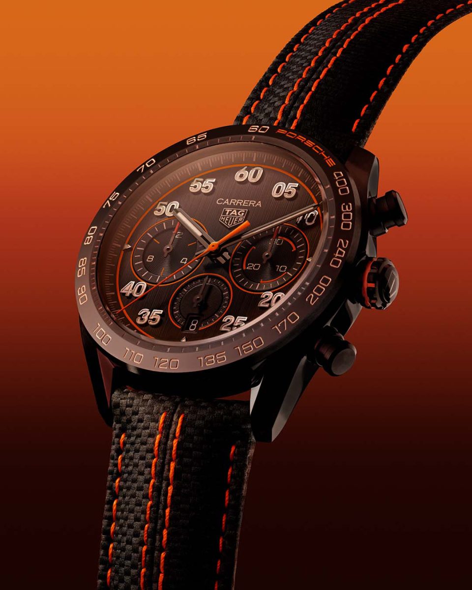 TAG Heuer Carrera X Porsche Orange Racing聯名計時腕錶在設計上保留了精緻的保時捷美學,更加入精選賽車元素。腕錶設計添加活力十足的橘色,靈感源自汽車在瀝青路面上,激起火花的顏色,也同時呼應速度的象徵─「火」的顏色。同樣的橘色亦可在錶圈上的Porsche保時捷標誌、漆面錶冠、錶面上「Azuré環形紋」計時盤,和橘色秒針的小巧思上發現。