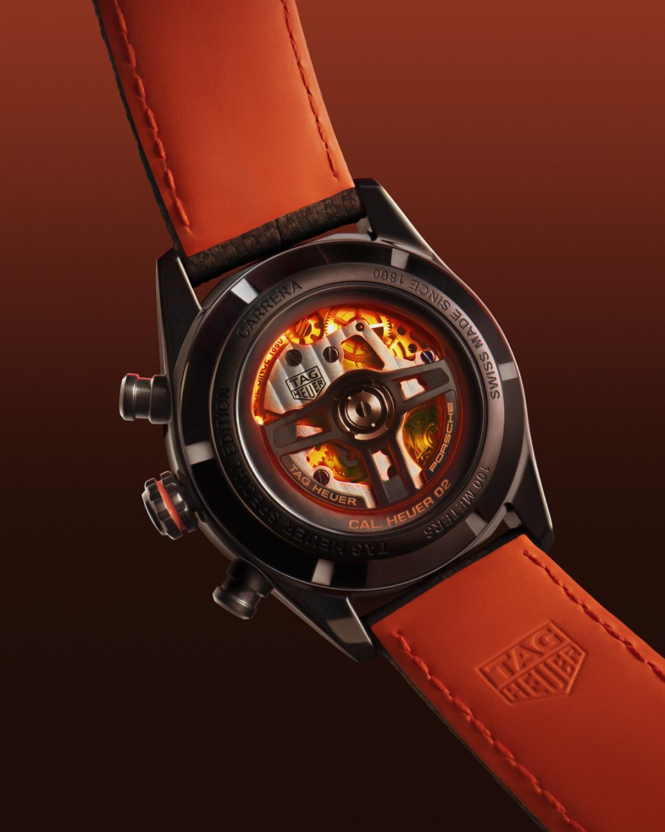 TAG Heuer Carrera X Porsche Orange Racing聯名計時腕錶,承襲著名的TAG Heuer Carrera系列運動計時腕錶,以及TAG Heuer X Porsche聯名限量腕錶之設計基礎。錶款搭載Calibre Heuer 02自製自動上鍊機芯,這款機芯完全由TAG Heuer泰格豪雅在舍沃內(Chevenez)的錶廠製作,由168個零件組成,包括導柱輪和垂直離合器。這些零件可提供卓越的計時性能,並提供80小時動力儲存。