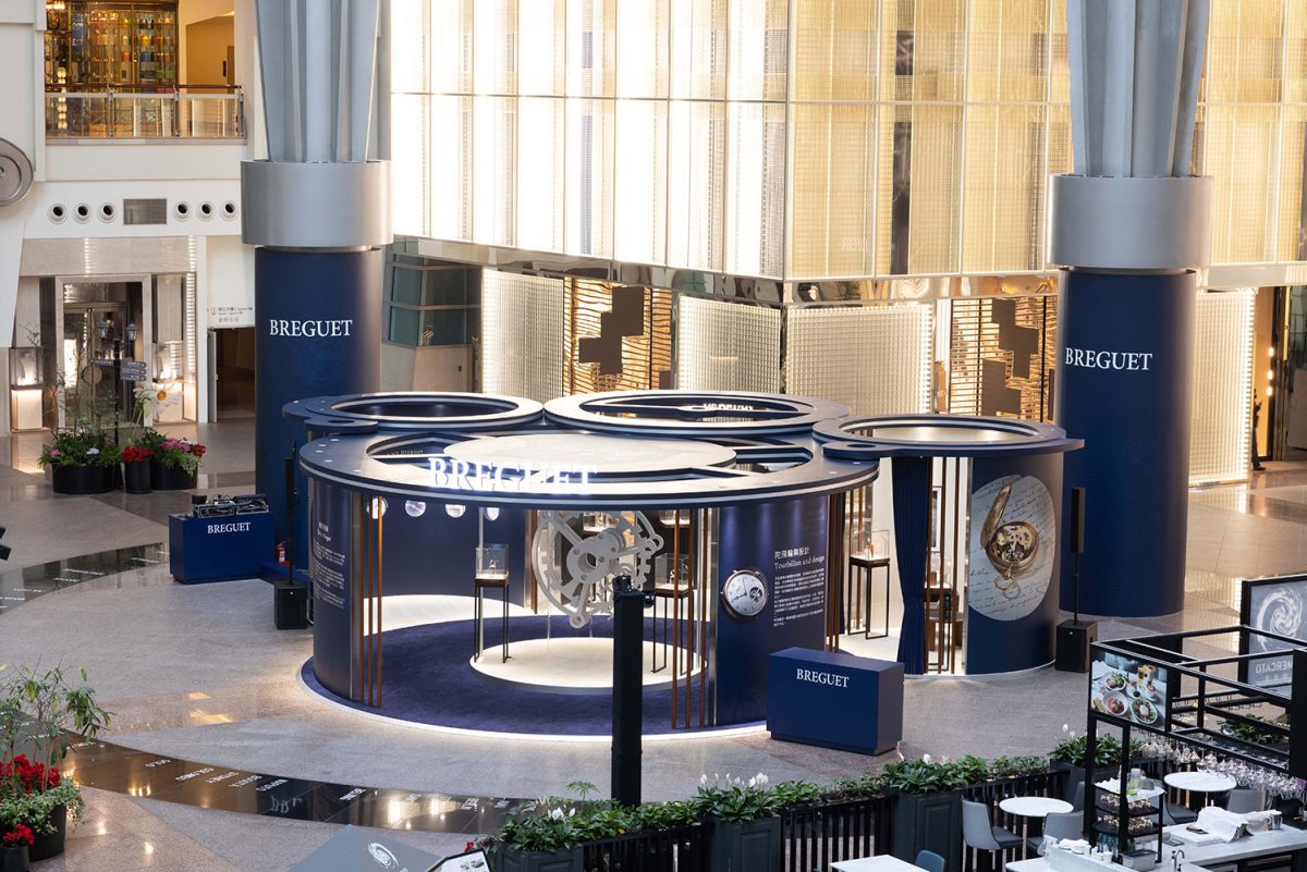The Art of Breguet寶璣與藝術期間限定店以寶璣最著名的發明-陀飛輪為靈感,將擺輪、錶橋等元素拆解重組,令參觀者俯瞰期間限定店外觀時,就可以感受到寶璣優雅簡約的設計美學。