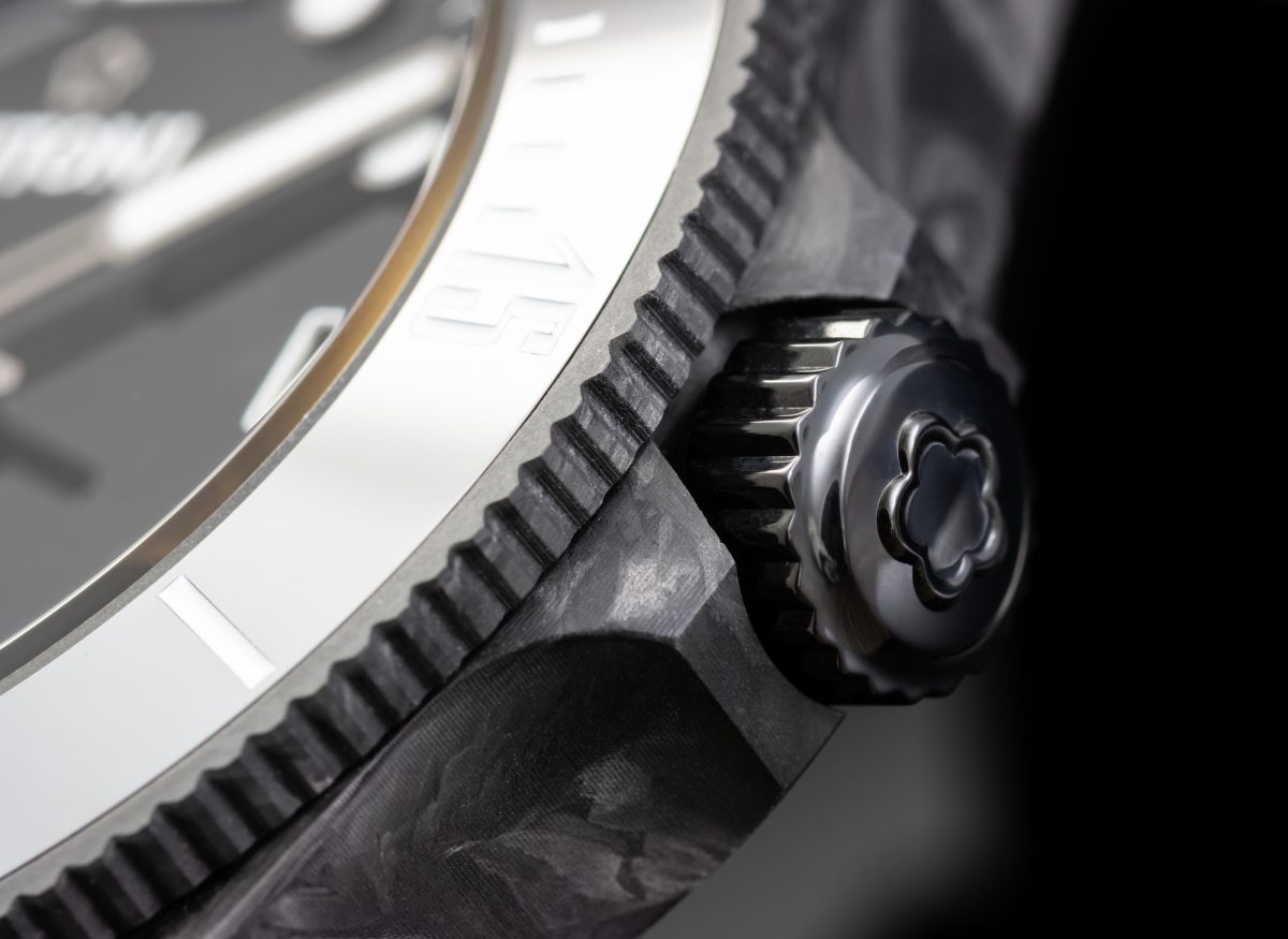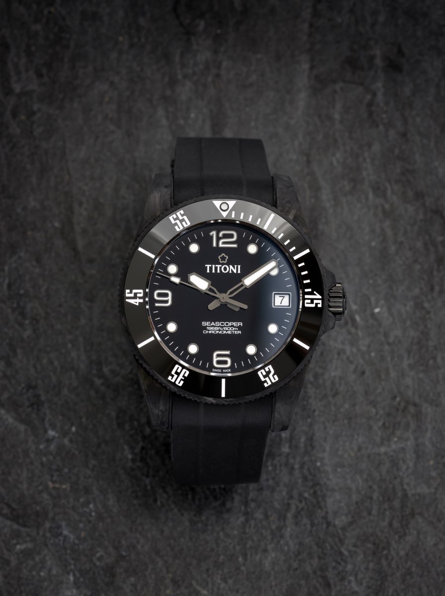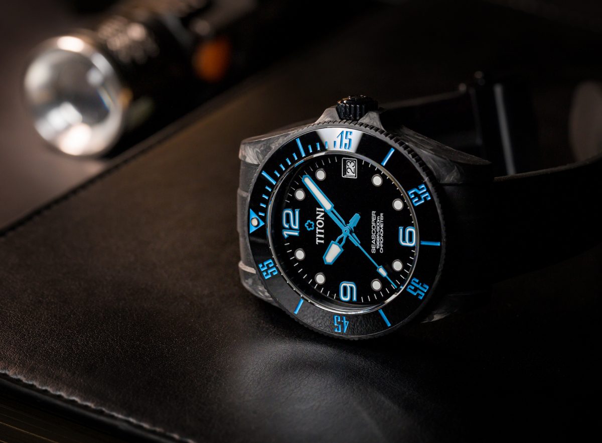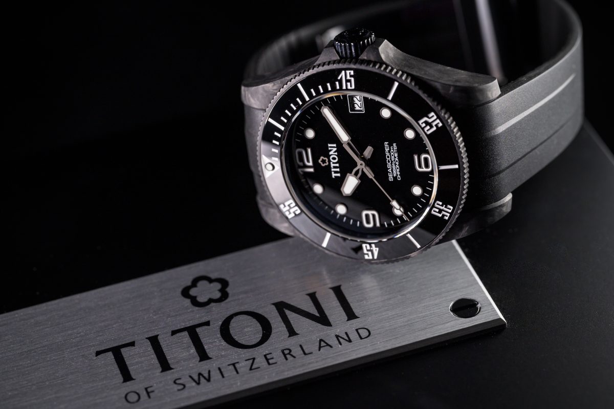 TITONI Seascoper CarbonTech使用的鍛造碳纖維技術,這項源自於藍寶堅尼的工業技術,利用高溫與高壓將碳纖維與金屬化合物快速結合,產生輕盈、耐腐蝕與十分堅固的特性,其重量比鈦合金輕約50%,更是比不鏽鋼少了80%!至今較被廣泛被使用在追求輕量與速度的超跑及一級方程式賽車中。