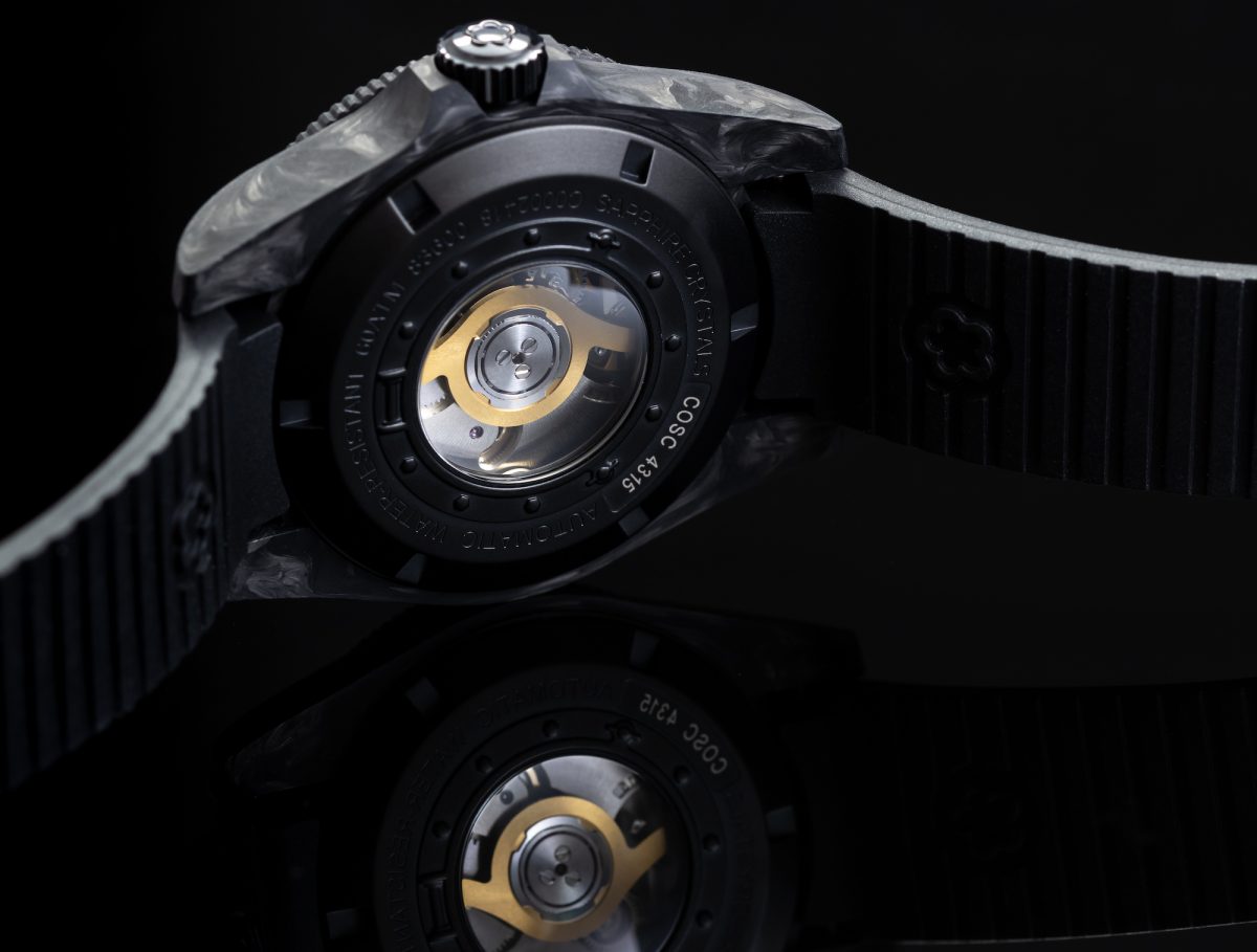 翻開錶背,Seascoper CarbonTech 同樣搭載TITONI的T10自製機芯靜靜躺在舷窗造型透明底蓋中努力運作。這款厚度只有 4.10mm 的超薄機芯,得以在¾夾板打造的極小空間內創造了大直徑的 3 日高動力 儲存,高級鐘錶使用的 KIF 避震器、32 顆可避免零件因密集接觸而快速磨損的高耐磨紅寶石軸承以及C.O.S.C 瑞士官方天文台認證,種種工藝盡顯TITONI 瑞士原廠對品質規格的執著與追求,也使得T10機心自2019品牌百週年推出以來,其精準與穩定度皆受到不少鐘錶界愛錶人士的廣泛認可與好評。