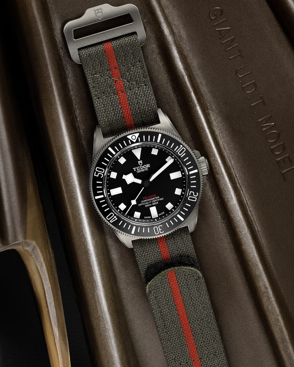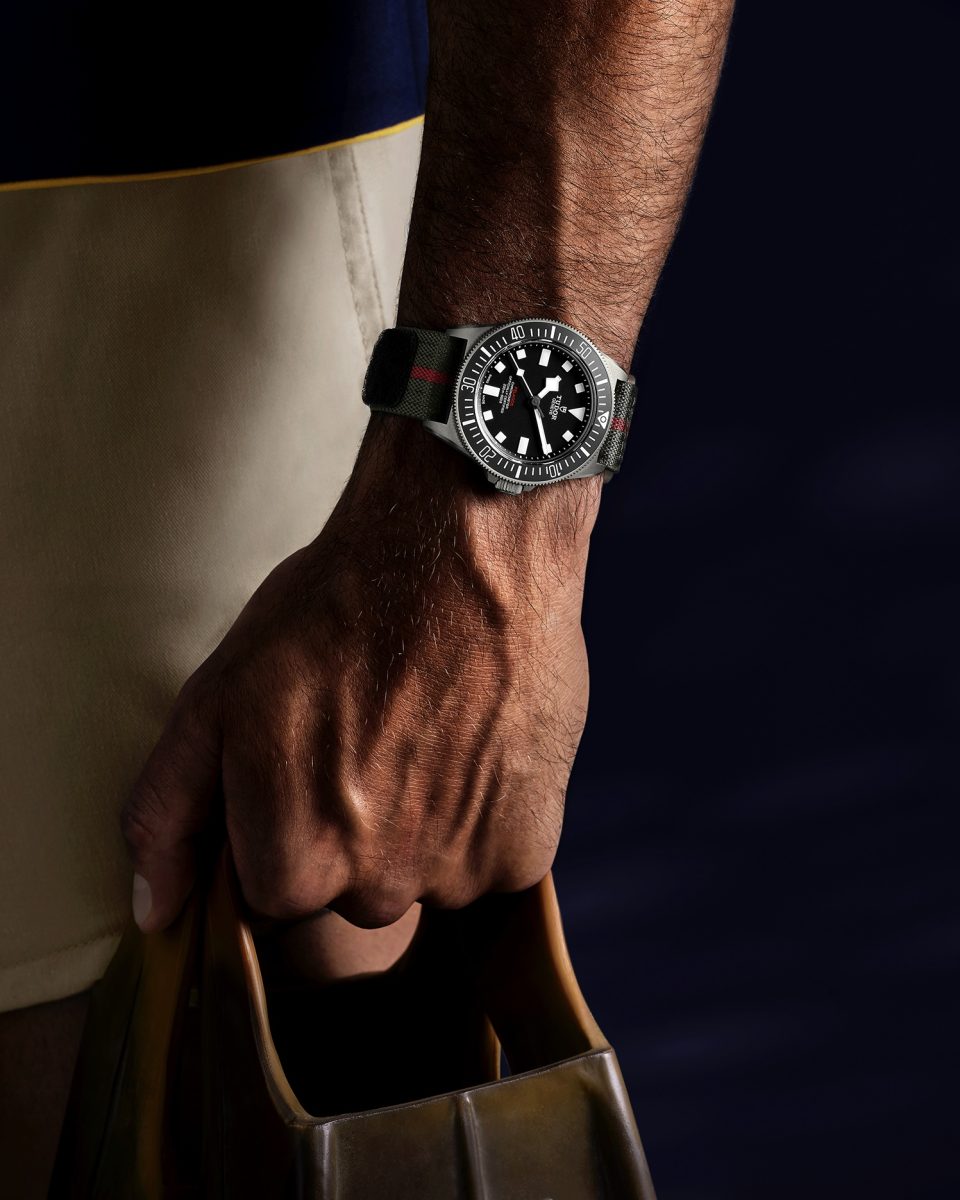 織紋錶帶亦是帝舵「軍用潛水腕錶」的傳統,尤其是尼龍材質的黑色或綠色一體式錶帶。因此,新款Pelagos FXD也特別推出兩款別緻錶帶以取代傳統錶鏈。主打配置為中央紅色條紋的軍綠色一體式織紋錶帶,配備自黏式帶扣,同時附送一條飾有深灰色浮雕織紋圖案的一體式橡膠錶帶,為腕錶經典造型注入一絲新意。