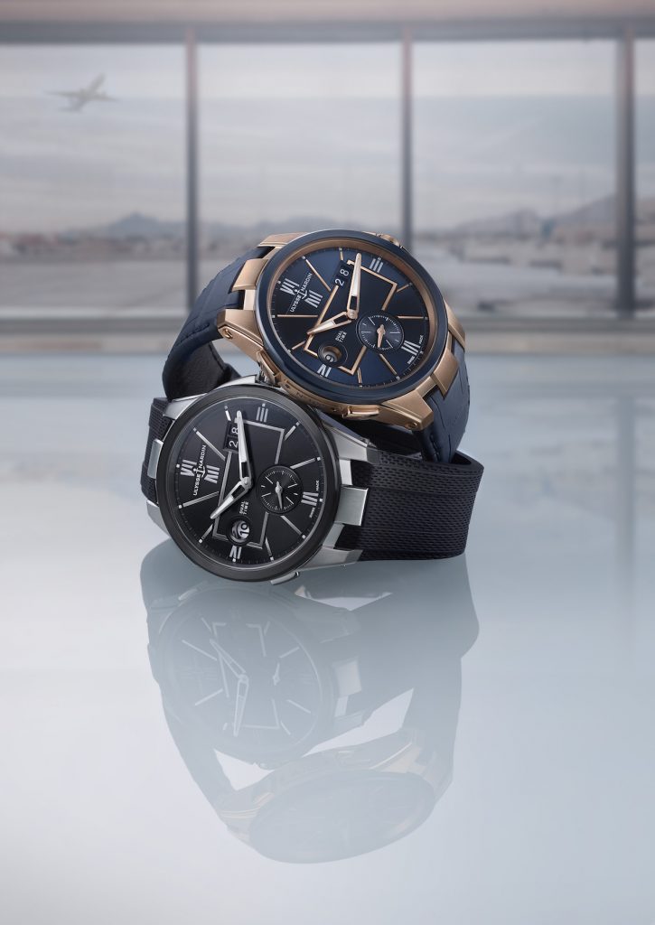 全新雙時區腕錶設計優雅精簡,搭載與鏤空X系列同款錶殼,採用經理人系列經典的三耳式錶耳,羅馬數字時標位於錶盤三點鐘、六點鐘、九點鐘和十二點鐘位置。除了日期、小時和分鐘顯示外,九點鐘時標位置還增加了專利”家鄉時間”顯示。在與錶冠相對的位置設有”+”、”-“按鈕,只需輕輕一按,即可向前或向後調校時針。