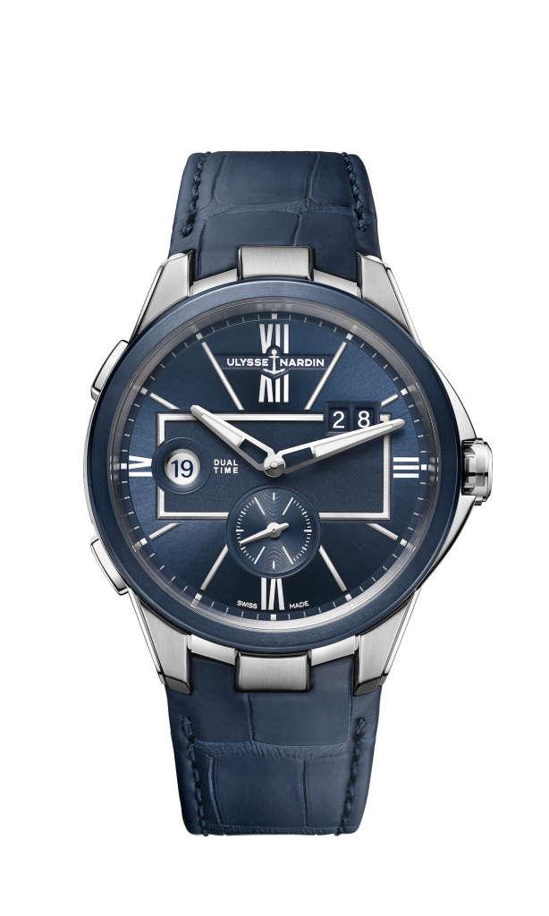 Ulysse Nardin雙時區腕錶/錶徑:42mm/機芯:UN-24自動上鏈機芯/動力儲存:42小時/防水深度:50m/建議售價: NT$657,900玫瑰金藍面錶款,NT$274,400不銹鋼藍面及黑面錶款