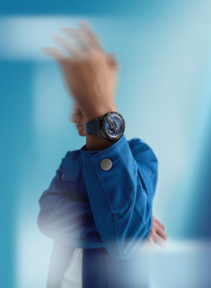 秉承Freak奇想系列的精髓,新款腕錶摒棄了傳統指針設計,改為以UN-240自製機芯的飛行卡羅素尖端指示分鐘,並在鐫刻太陽放射紋的藍色可旋轉圓盤上顯示小時。超大尺寸擺輪和游絲則令整體構造更具視覺張力。作為腕錶律動心臟的擒縱機構表面塗覆DiamonSil®鑽石矽,這一先鋒材質由雅典錶於2009年申請專利,透過在矽質零件表面覆以人造鑽石塗層,賦予其出眾的堅固耐磨特質。