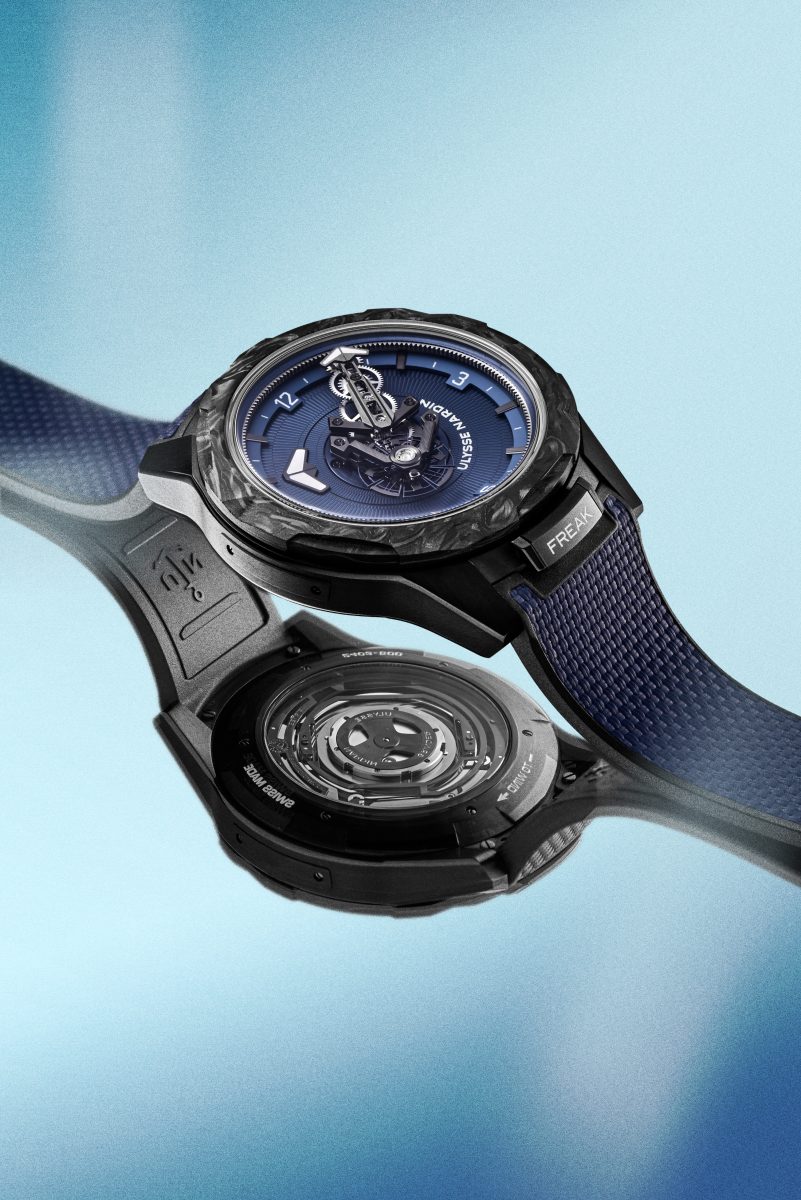 Freak ONE NAVY BLUE奇想腕錶承載飛行卡羅素及其矽質擺輪和擒縱機構的橋板兼作分針,發條蓋作為時針。新款腕錶搭載雅典錶創新研製的高效Grinder®磨床式自動上鍊系統,擁有長達90小時的動力儲存,經由錶底蓋的內置機構上鍊。腕錶配備兩款橡膠錶帶可供選擇,其中30%的材質由生產過程中的橡膠廢料回收再造而成。