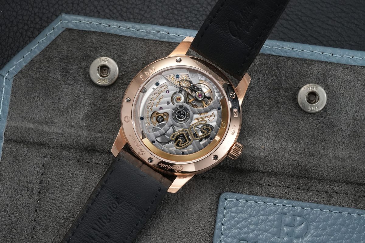 翻到錶背可以看到格拉蘇蒂原創自製 Calibre 36-24機芯,具備至少 100 小時動力儲存,並搭載防磁矽游絲。此外新款腕錶的21K 金自動盤使用了全新鏤空雙 G 標識,讓精美修飾的機芯能更加清楚地被欣賞,包括四分之三夾板、柱狀紋打磨、鵝頸式微調、手工雕刻擺輪等經典德式工藝元素。