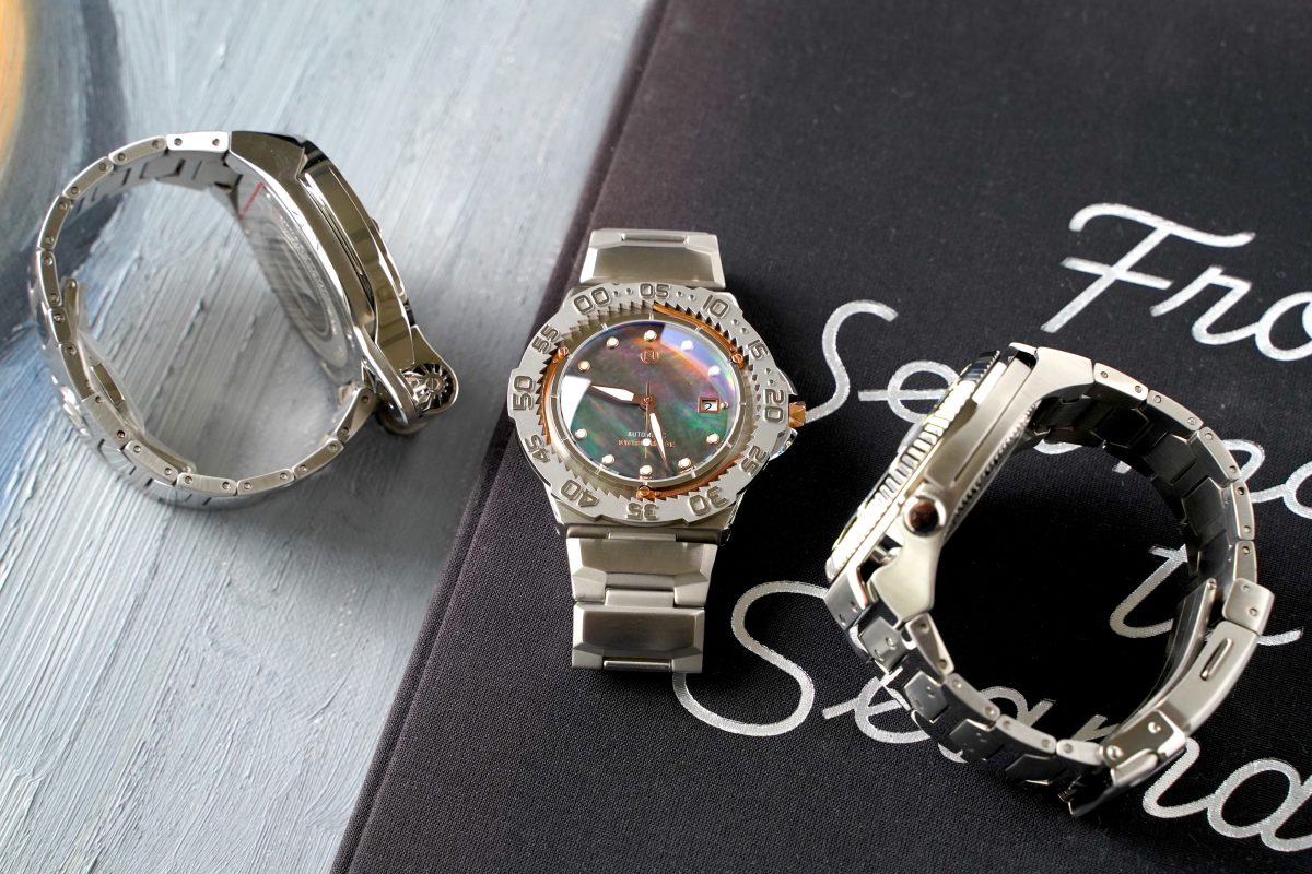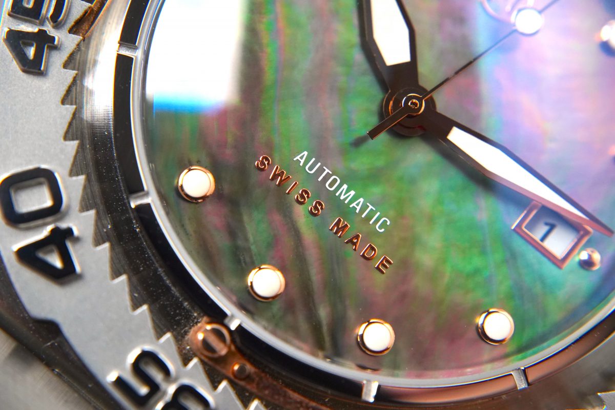 外顯的潛水圈結構,也成了這只錶另一個特色,而華麗的部分則是在錶面呈現,採用的是大溪地珍珠母貝面盤,配合是一些細節的PVD coating以及時標,指針的Super-LumiNova®塗層,錶面以及背透的部分則採用了雙向弧形藍寶石水晶玻璃,算是符合華麗這個訴求