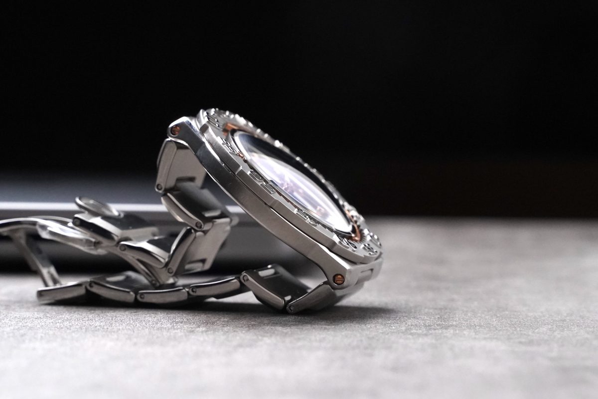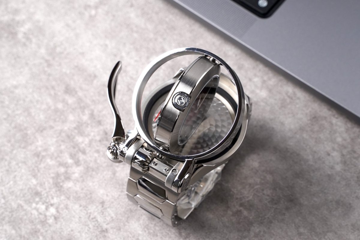 為了配合纖薄化潛水圈而放大錶徑,所以錶徑的尺寸也來到了46mm,而原本只有6.3mm的錶殼,因為上下都裝上弧形藍寶石水晶玻璃,而使得整體厚度來到了13.05mm,錶帶,帶扣,細節的處理到位,配戴的舒適度也不錯。