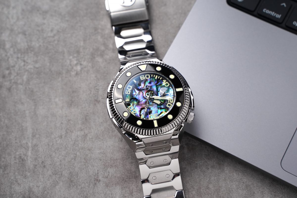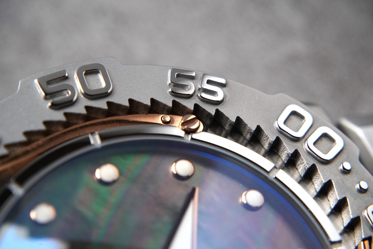 說是倒數分鐘圈,應該是倒數分鐘盤比較貼切,覆上夜光塗層,與外圈連動,可雙向旋轉,透過一個連桿擋板,來防止誤觸,也由於多了這個連桿擋板,將旋入式錶冠的位置下移到了4點鐘位置,3點鐘位置的日期視窗有放大鏡,指針,時標,到數分鐘刻度都覆有Super-LumiNova®夜光塗料,面盤採用鮑魚殼材質,呈現的是海洋色調的光澤。