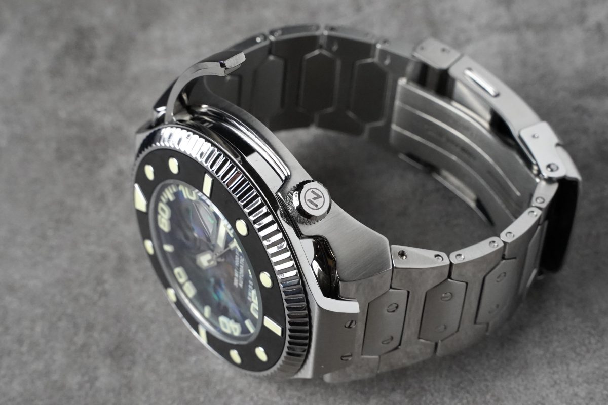 再來要介紹的兩只都是潛水錶,第一只要介紹的是強調潛水圈機制,外型風格強悍的Atlantean是一枚防水深度達到300米的潛水錶,最大的特色是潛水圈的機制,潛水圈上方的時標圈是固定的,而是透過轉動潛水外圈帶動鏡面下的倒數分鐘圈,這算是比較少見的設計。