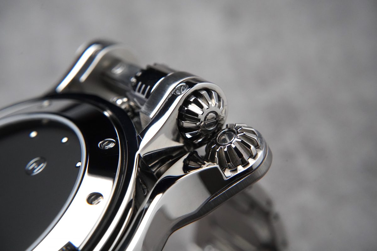 第一款我想介紹的是Gemini的雙面錶,市面上雙面錶也見過不少,但這款NOVE的Gemini是我看過換面方式最特別,也最快速的,透過推動一根連桿,可以瞬間換面。細看換面的原理也不難,就是透過兩垂直的齒輪,做到在拉動連桿時,拉升錶殼並換面,原理或許不難,但業界就沒人這樣做過。