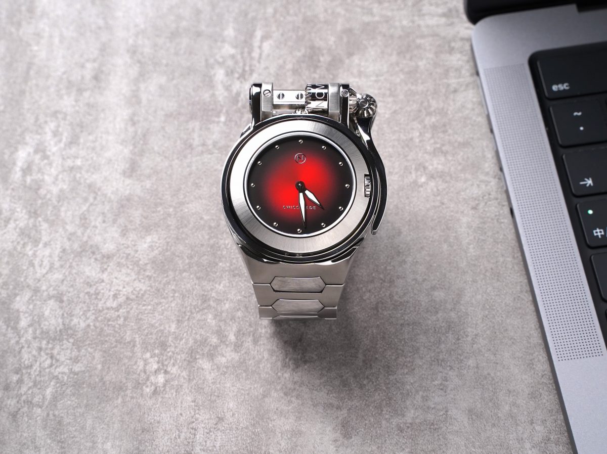 雙面錶,當然有兩個錶面,搭載了兩枚瑞士石英機芯,啞黑面的是小三針,漸層紅面的是兩針,除了可以隨時換錶面換風格,也可以當雙時區手錶,需要調整時間時,由於錶殼還有個外圈,所以這只錶有刻意將錶冠內縮,可以用指甲輕鬆撥出錶冠校時,操作上並不難。整只錶的細節處理,從錶殼,錶殼外圈,連桿,槓桿齒輪,到錶帶,帶扣,整體的細節處理,相當到位,甚至優於這個價位帶的手錶該有的呈現,唯獨就是尺寸大了點,但這也是這只錶的風格呈現。