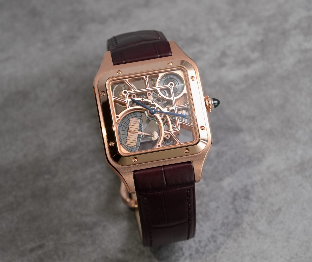 Santos-Dumont鏤空腕錶/直徑:31mm/機芯:9629 MC型自動上鍊鏤空機芯/動力儲存:44小時/防水深度:30m/建議售價: 玫瑰金錶款 USD 40,400 精鋼錶款 USD 31,000 黃K金和海軍藍真漆錶款 USD 41,600。