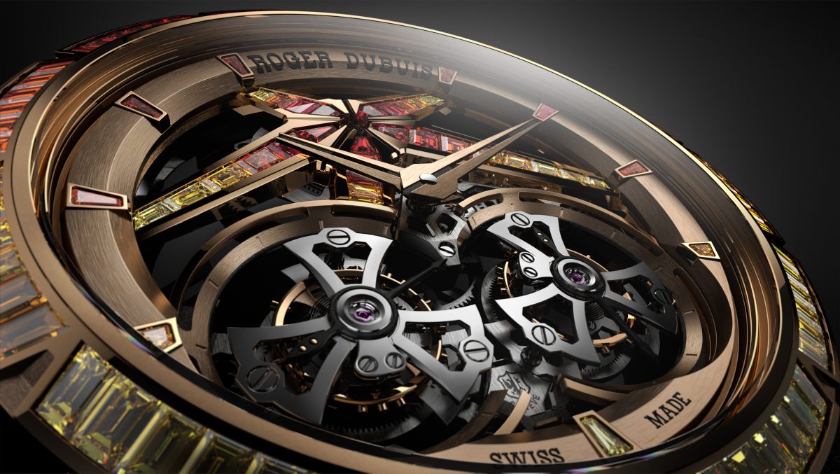 圍繞錶身的絢麗色彩由108顆寶石組成,每顆寶石均經過極其精準的長方形切割,並以旭日初升漸變的效果排列在腕錶周圍。錶圈上鑲嵌72顆寶石,標誌性星形設計中以27顆寶石點綴,而凸緣上更裝飾了9顆寶石,形成壯觀的效果,紅色寶石方面,品牌選擇了鮮豔的石榴石,賦予腕錶活力和魅力,豐富旭日初升的深邃感。在下一個漸變層次上,顏色由以其高閃光和橙色光澤而聞名的寶石-橙色錳鋁榴石組成。最後,Roger Dubuis羅杰杜彼選擇了具有不屈不撓能量的黃色藍寶石作最淺色調。