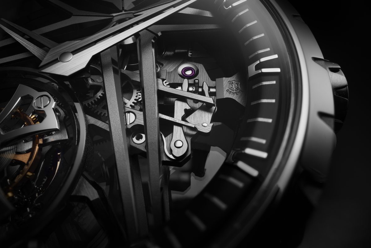 Excalibur Titanium Monotourbillon 王者系列鈦金屬單陀飛輪腕錶,以符合人體工學的腕錶設計,展現簡約魅力,完美演繹 Less Being More 極簡主義,亦是 Roger Dubuis 羅杰杜彼鏤空製錶工藝的最純粹典範。