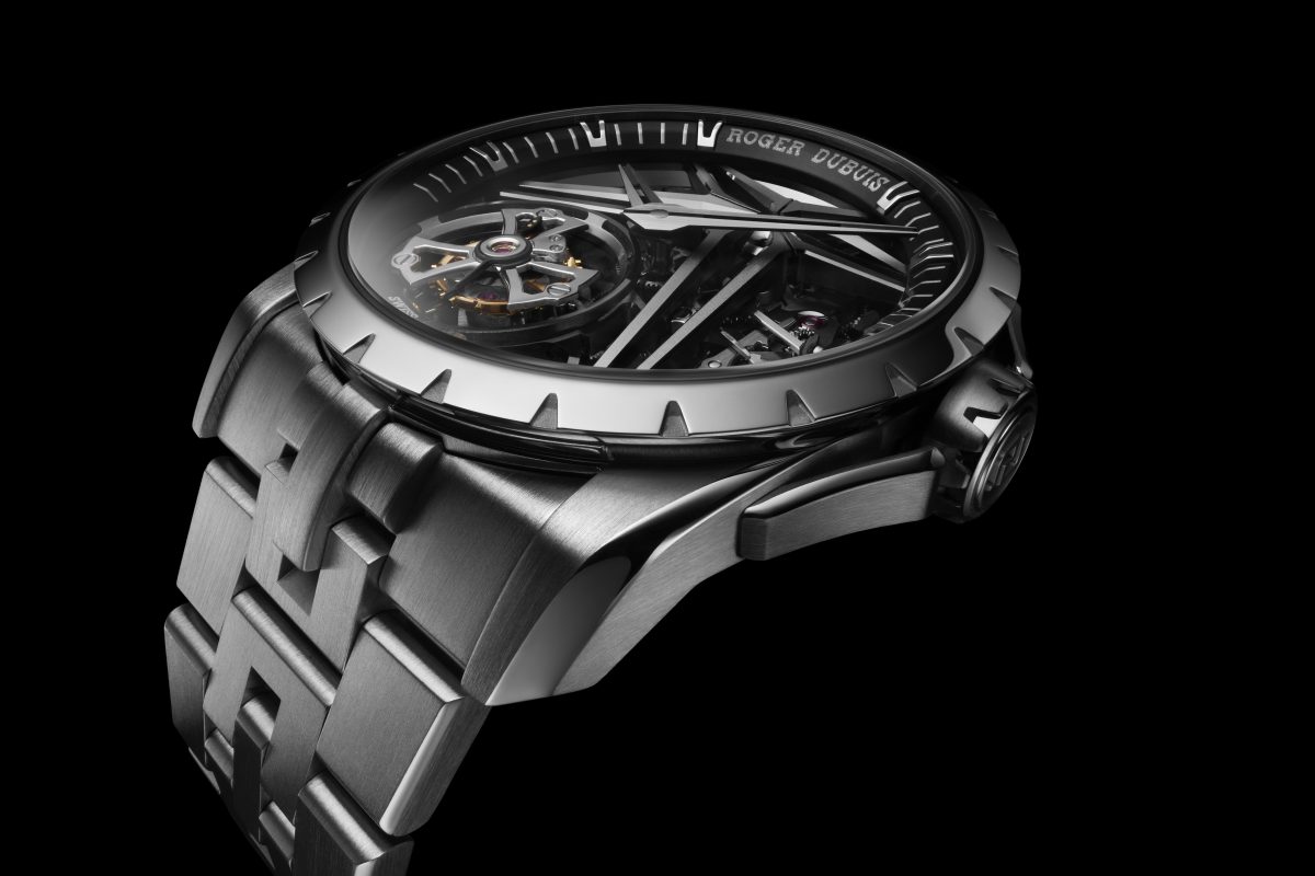 五級鈦金屬是「隨行」設計的基石,對錶匠而言,加工軟金屬的難度本已很大,更何況他們要同時修飾錶殼和凹口錶圈。而使用鈦金屬比不鏽鋼輕近兩倍,卻更加強韌,配戴舒適且能防止日常的磨損。金屬帶來的錶面色澤呈現出高級的啞金屬光,搭配錶鏈以閃亮拋光斜面修飾,對比鮮明,加上深灰色處理的經典Roger Dubuis羅杰杜彼星形標誌,一展輕奢設計。