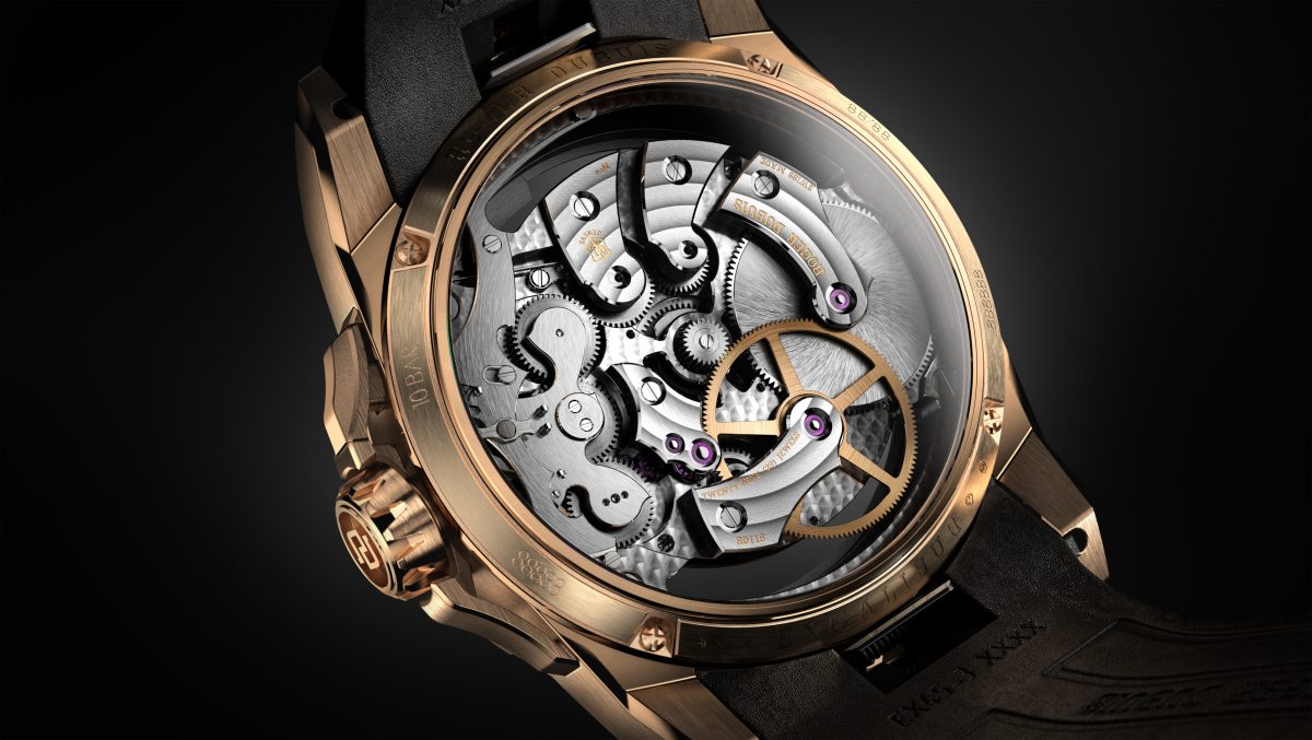 底蓋藝術則以巴洛克風格作主軸,設計蘊藏多個細節,包括源自經典日內瓦高級製錶傳統的錶橋、較圓弧的線條,以及機芯運用的 19 項裝飾技術,如優雅的魚鱗紋、日內瓦波紋及蝸形紋等。充滿動態的鏤空工藝不負眾望,讓此錶款成功獲得日內瓦印記的認證,屬高級製錶業最受認可的標誌之一。