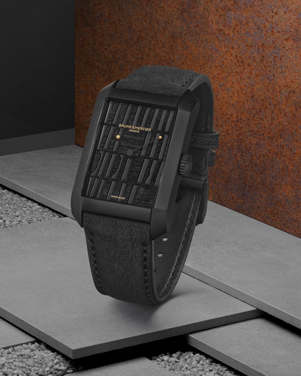 矩形 DLC 精鋼錶殼經過噴砂處理,隨後透過 PACVD(等離子體化學氣相沉積)沉積 2 公釐厚的氫化無定形碳離子層,使其硬度達到 6000 HV 維氏硬度。錶殼由塗有雙面防反射塗層的拱形防刮藍寶石水晶保護。鏡面下「Baume & Mercier」字樣採用金屬化處理。錶殼底蓋也由藍寶石水晶保護,並由四顆螺絲固定,刻有「Hommage à Pierre Soulages n° xxx/328」字樣。